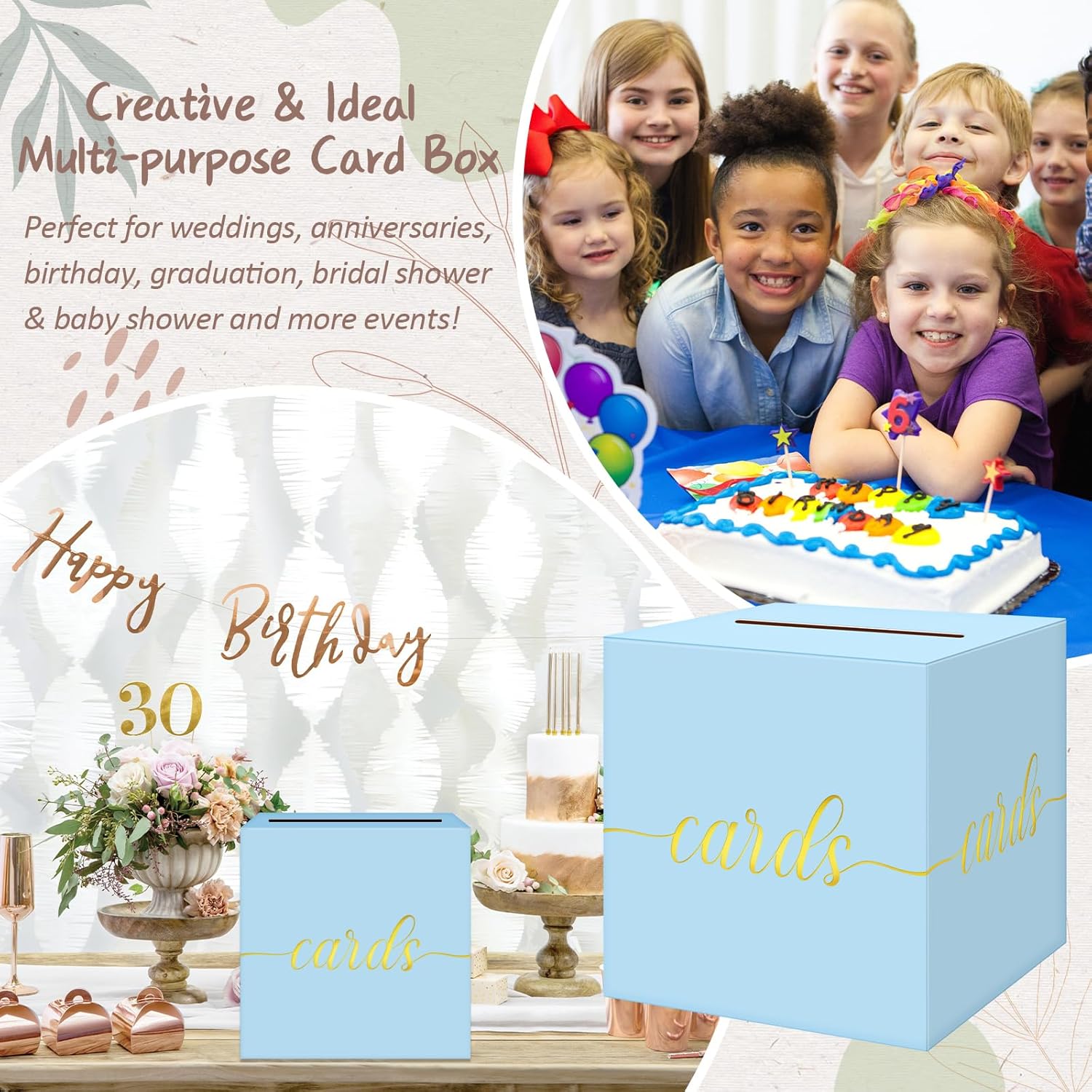 QIKSION Light Blue Wedding Card Box, Gold Foil Gift Card Box for Party, Wedding Reception, Birthday, Baby Shower, Raffle, Graduation