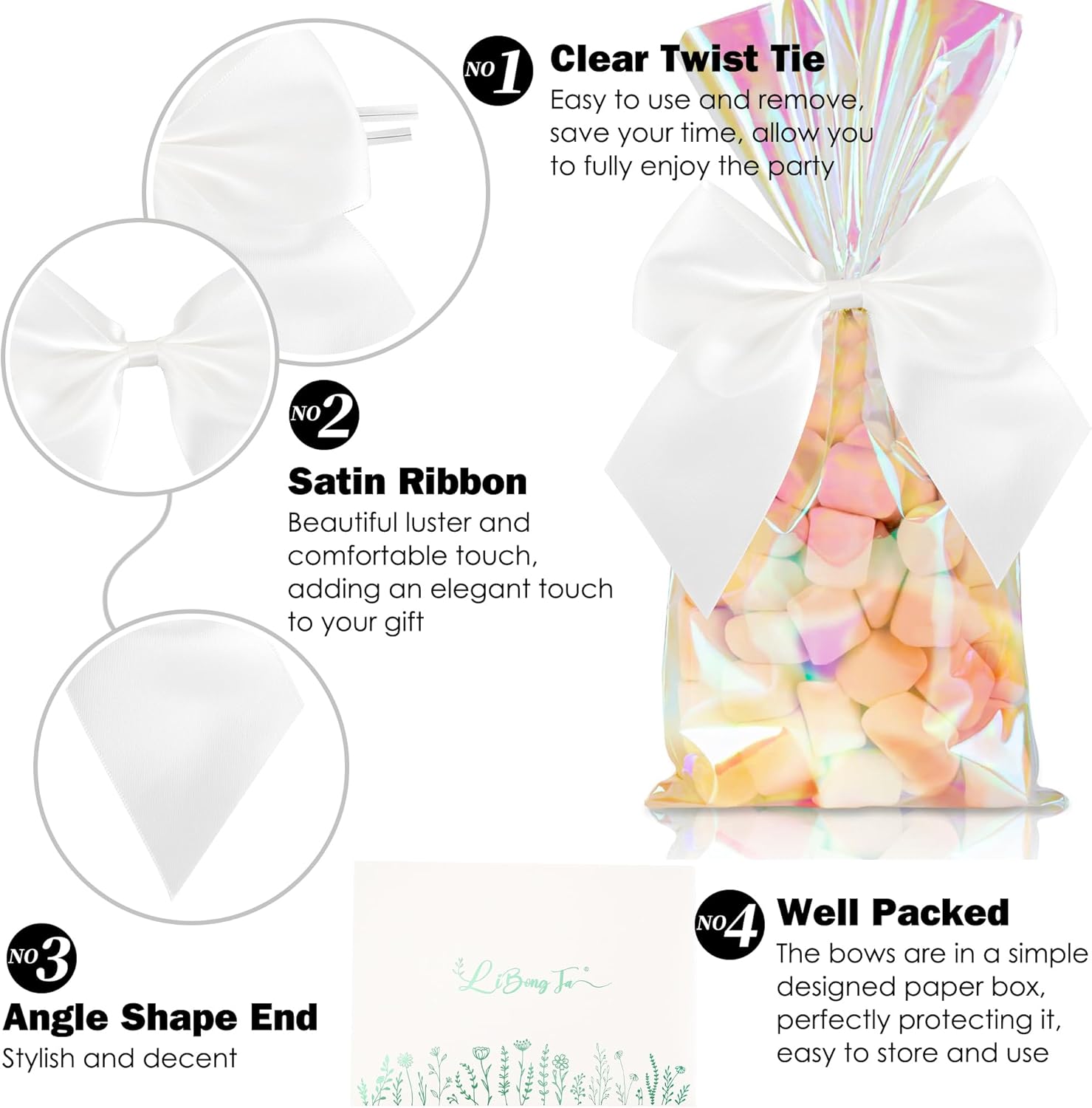 5'' White Bow Party Decorations Satin Bows, Twist Tie Bows for Treat Bags, Cake Pops, Pre-Tied Bow Premade Ribbon Bows for Crafts, Holiday Bows for Gift Wrapping, Wedding Decor-24 Counts
