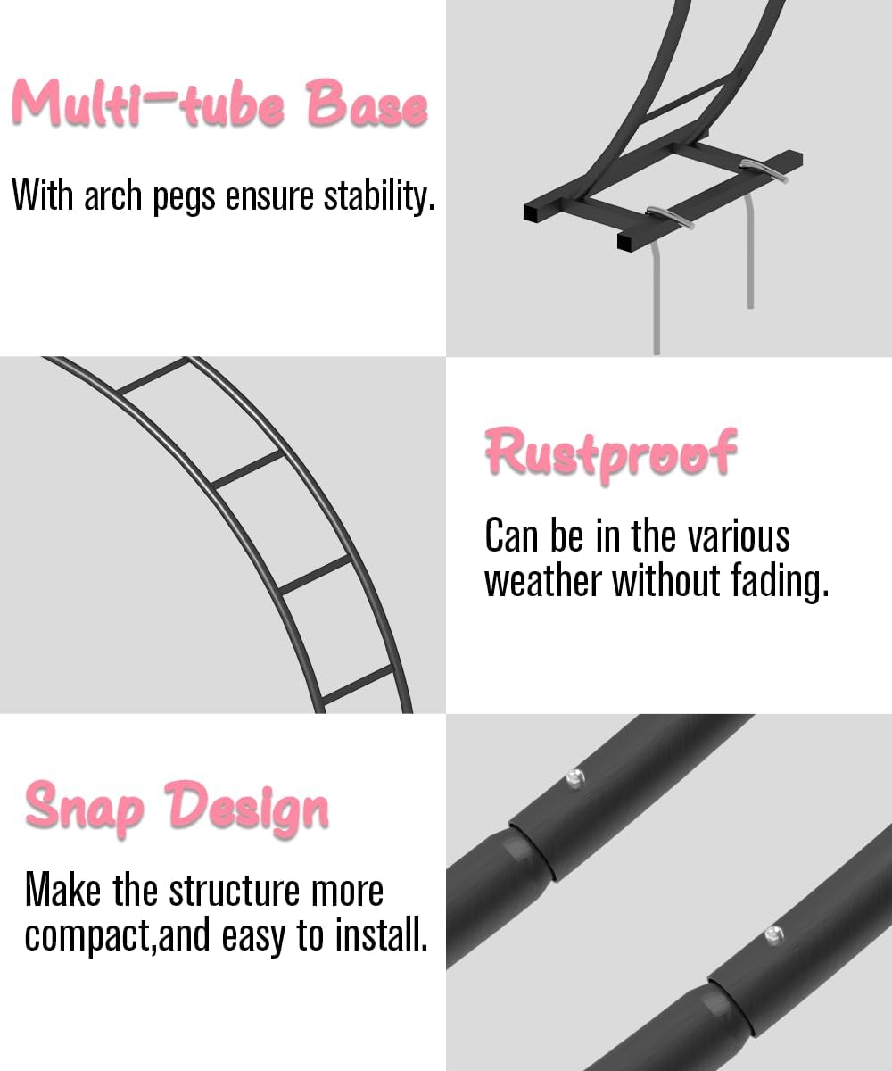 • Double-Tubes Construction: This garden arch features a robust double-tube structure with a sturdy base, ensuring exceptional stability and balance. The snap design contributes to a more compact and durable construction, making it suitable for both indoor and outdoor applications.
