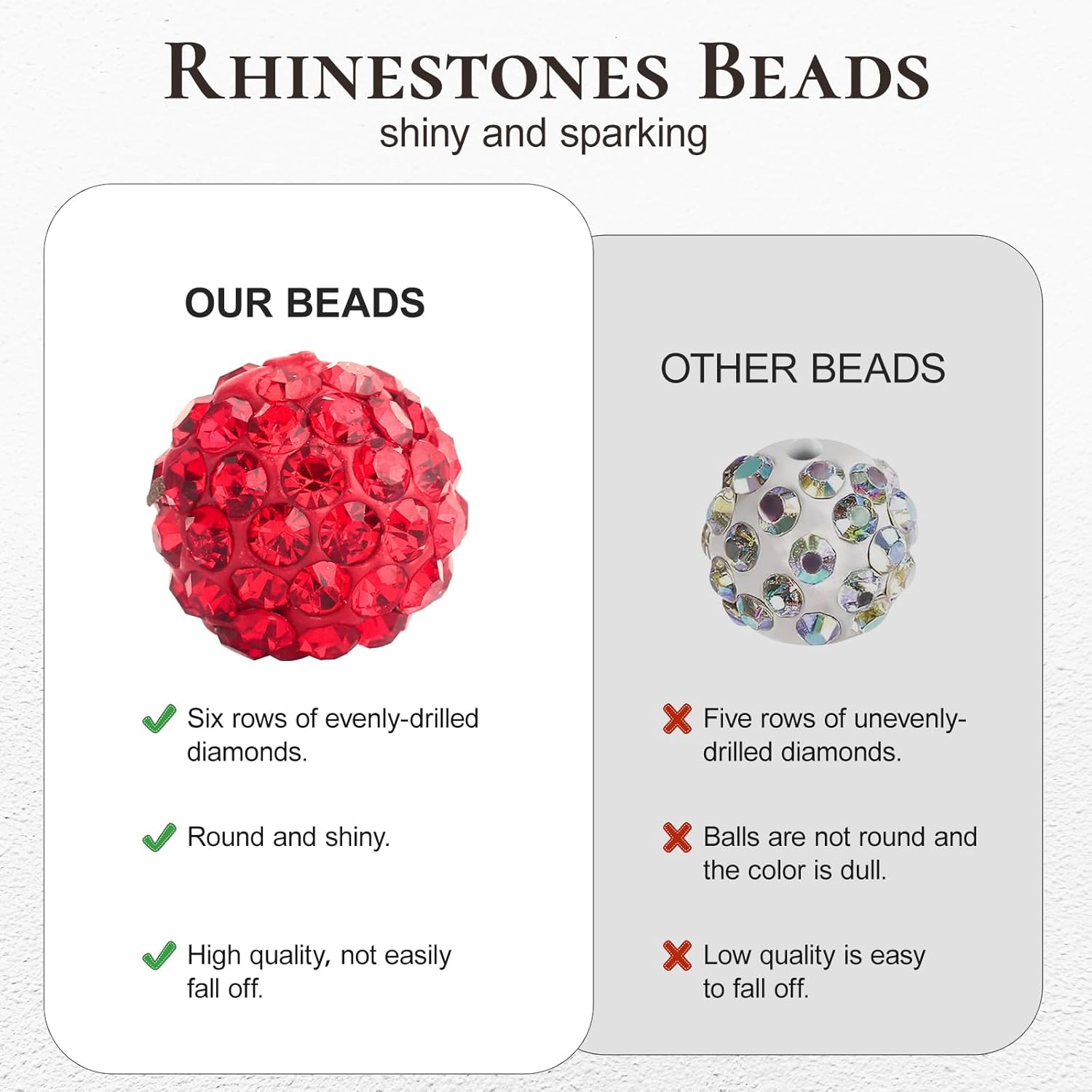 • UNIFORM RHINESTONE BALLS: Round clay beads are decorated with six rows of full diamonds, and high-quality glass rhinestones are evenly distributed on the surface of the sphere, giving the overall visual layering of the beads. The beautifully shaped clay rhinestone beads are as colorful as disco balls, making the handmade jewelry richer.