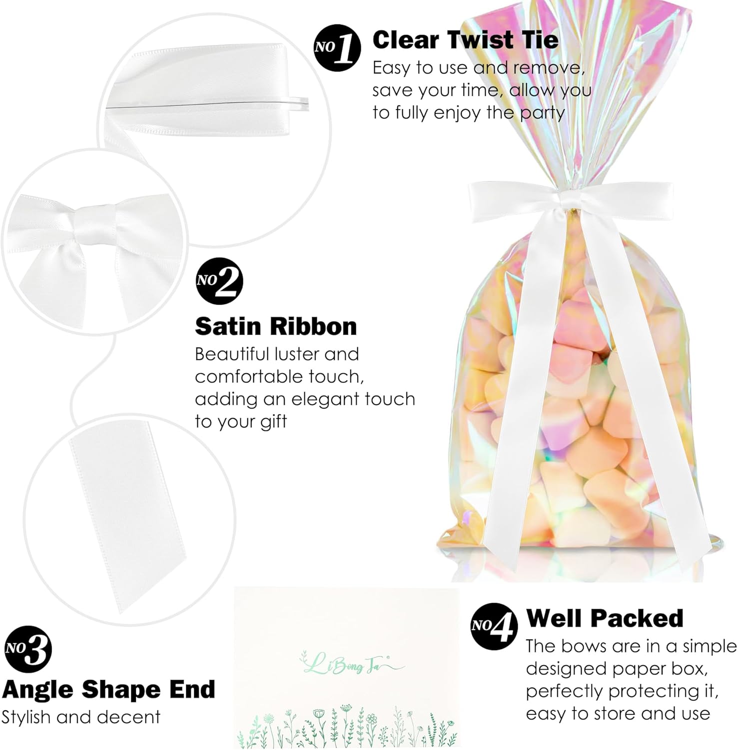 • Use: Convenient design of pre-tied twist tie bows from LiBongTa gives your bags, crafts and gifts wrapping a fancy look without the hassle. These ribbons are already knotted up in a cute gift wrap bow, so all you need to attach them to the gift with twist tie.