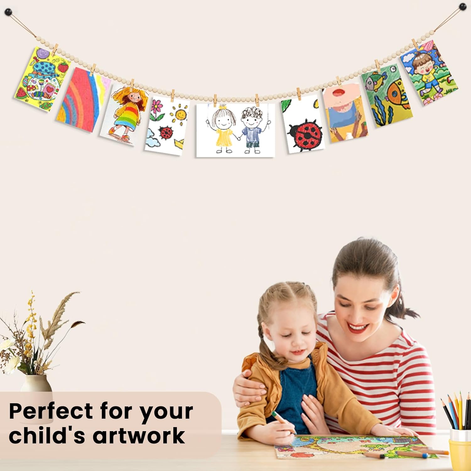 • The total length of wood bead garland is 54.8". Each garland includes 10 clips, you can give your custom wall art a makeover any time you want by simply removing or adding photos. Easily add some special to your beautiful bohemian home decor, sweet farmhouse decor, or modern minimalist style