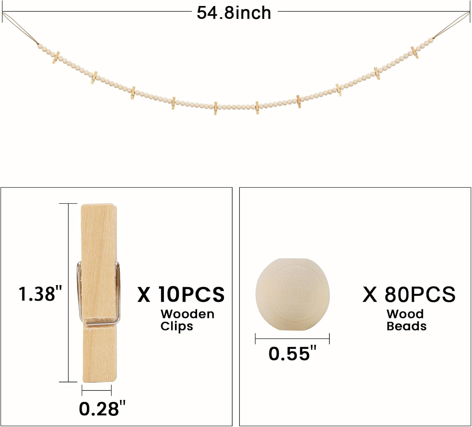 • The total length of wood bead garland is 54.8". Each garland includes 10 clips, you can give your custom wall art a makeover any time you want by simply removing or adding photos. Easily add some special to your beautiful bohemian home decor, sweet farmhouse decor, or modern minimalist style