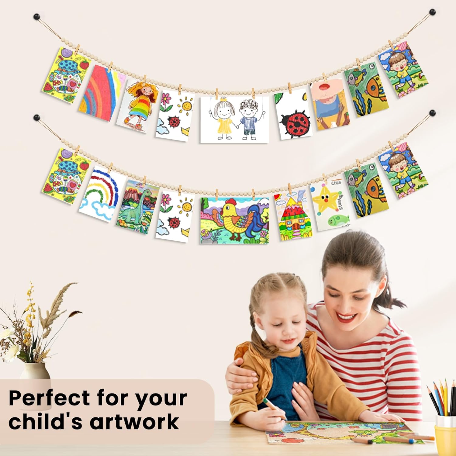 • This hanging photo display is hand-made with natural wooden beads and jute rope, durable, corrosion-resistant and non-toxic, not easy to break and fade. Natural wood beads have a polished finish that is smooth. You can paint and color it to complete your personalised decoration.