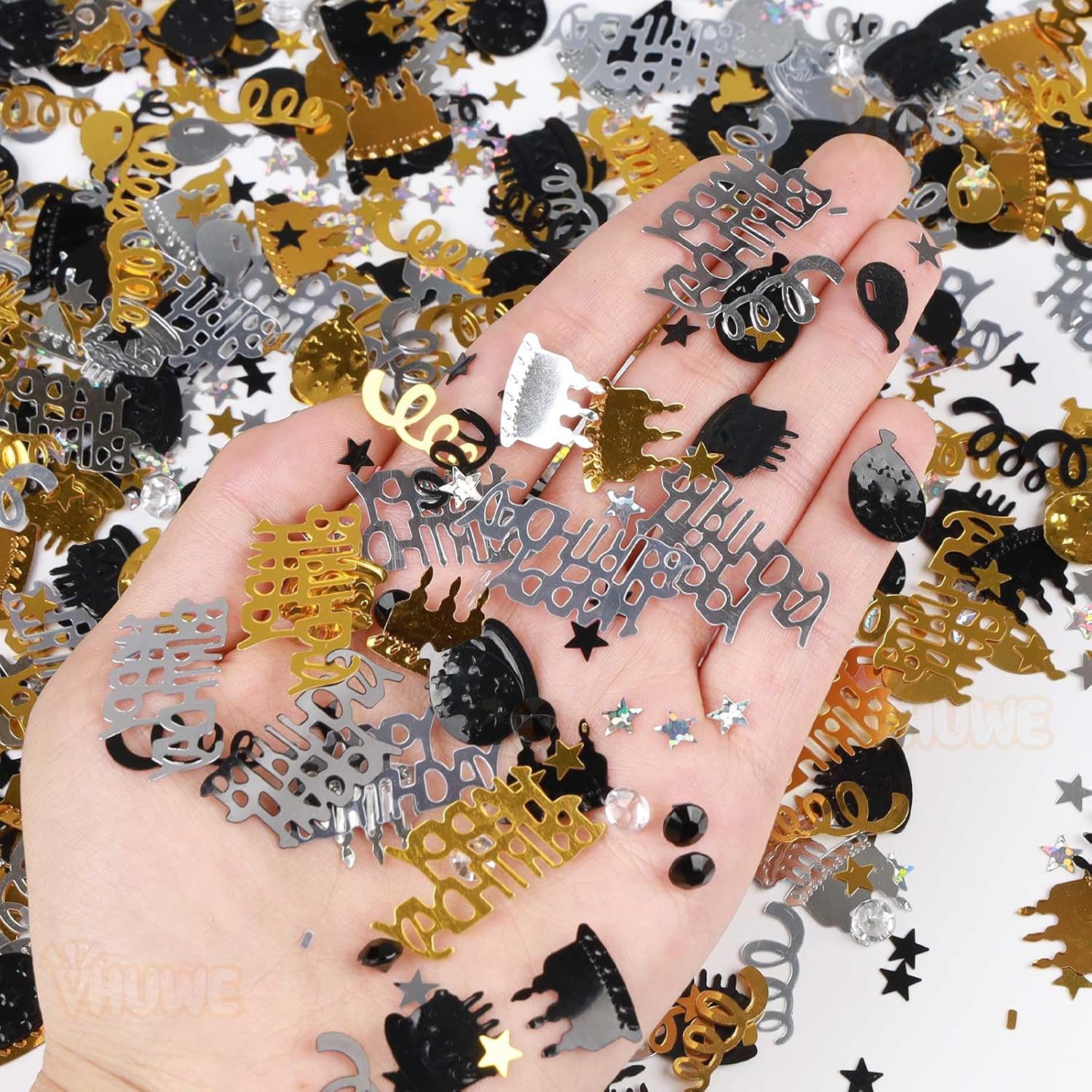 VHUWE Happy Birthday Confetti, 1.6 oz Black Gold Silver Cake Balloon Star Goblet Bottle Glitter Confetti for Happy Birthday Party Decorations Boys Girls Kids Women Men Birthday Table Decorations