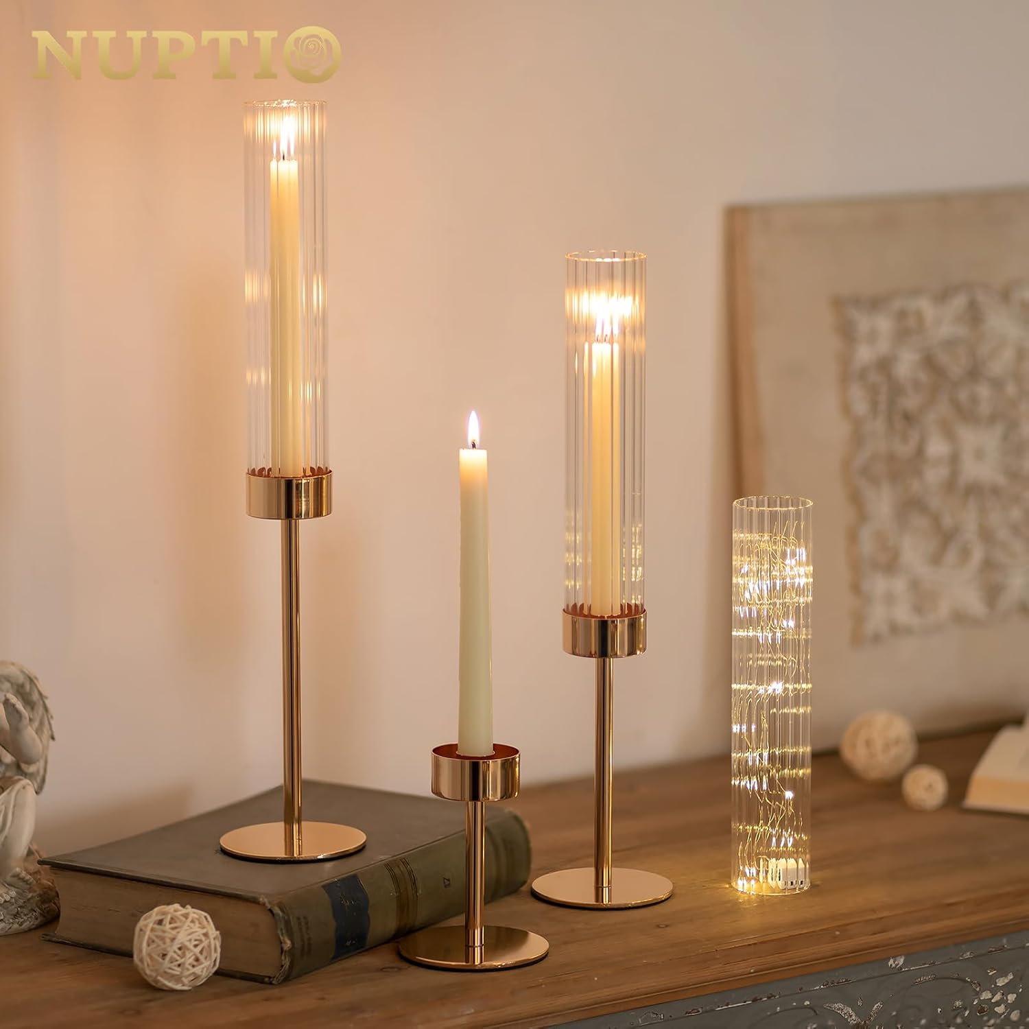 NUPTIO Hurricane Glass Candles Holder: 18 Pcs Gold Taper Candle Stick Holder Bulk - Modern Candlestick Decor with Tall Ribbed Chimney Sleeve for Thanksgiving Christmas Centerpiece