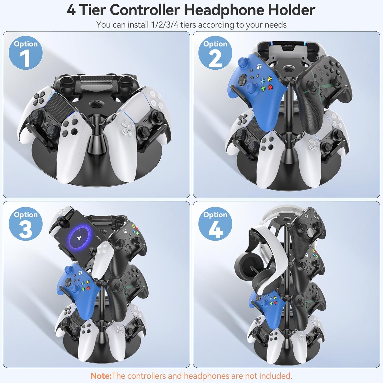 Headset Stand 4 Tiers for Desk, Rotatable Gaming Controller Stand for PS5/PS4/Xbox/Switch2/PS Portal/Phone, Universal PC Gamer Gift Accessory Controller/Headphone Holder for 12 Packs Controller