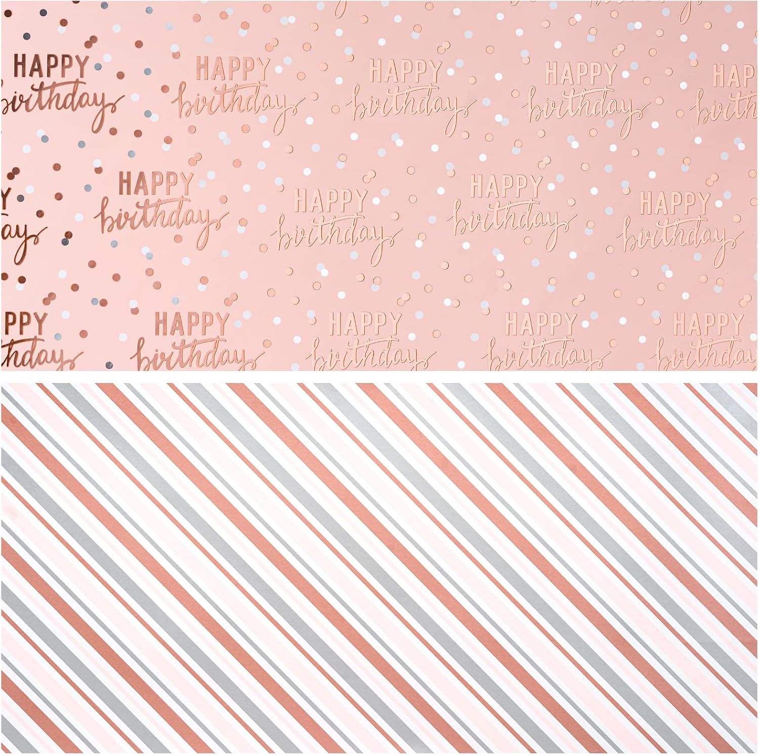 • HAPPY BIRTHDAY WRAPPING PAPER - This pink birthday wrapping paper features a charming dual-sided design. One side has a peach background with "Happy Birthday" text and scattered polka dots in elegant metallic rose gold foil. The reverse side presents a striped pattern in soft, coordinating tones, perfect for a modern and polished look.