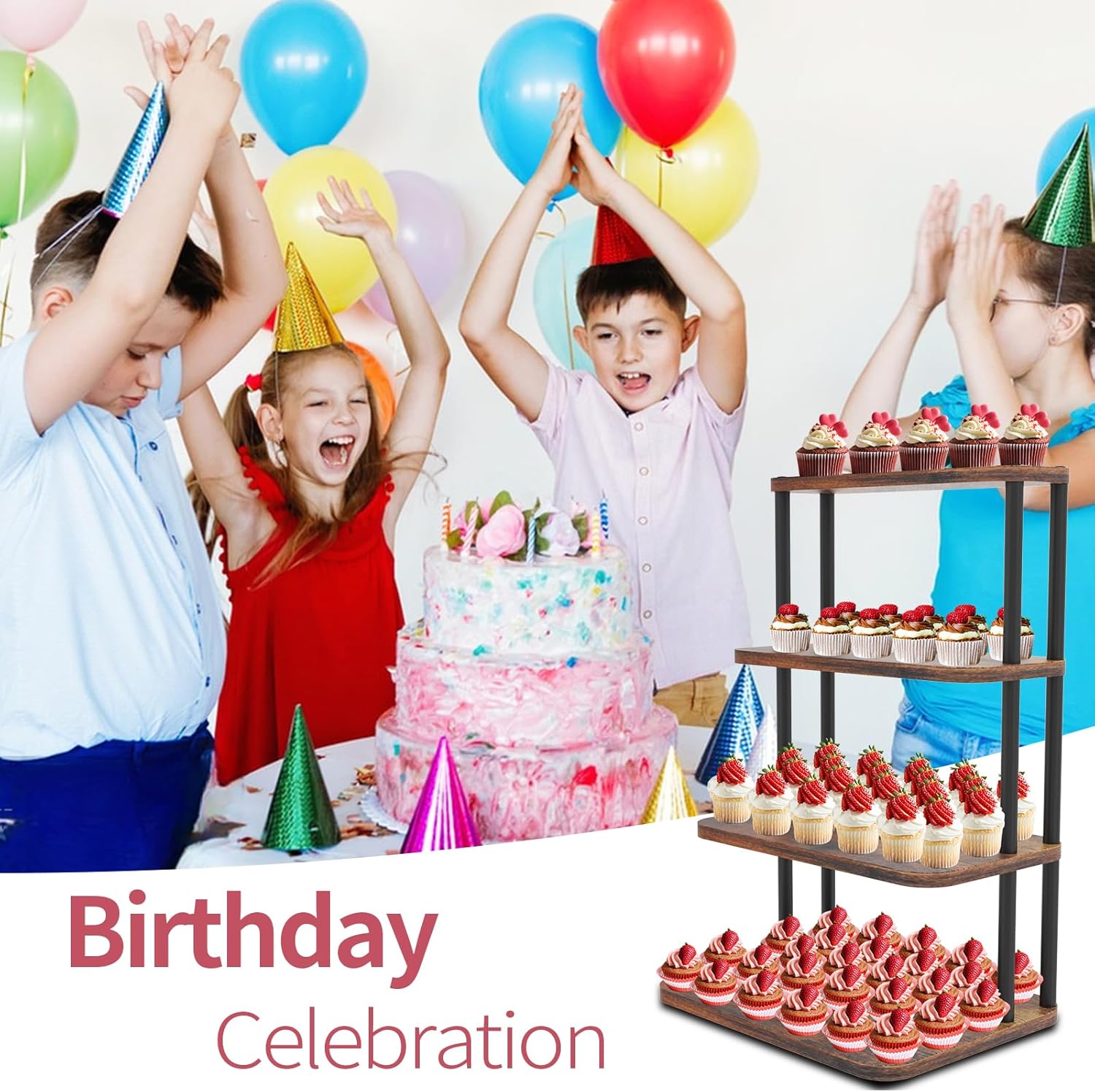 • 4 Tier Cupcake Stand: This cupcake tower features a rustic style design, The artfully curved edges and warm wood tones create a charming display for your cupcakes or cake, glowing under party lights. Transform your dessert table into a perfect showcase.