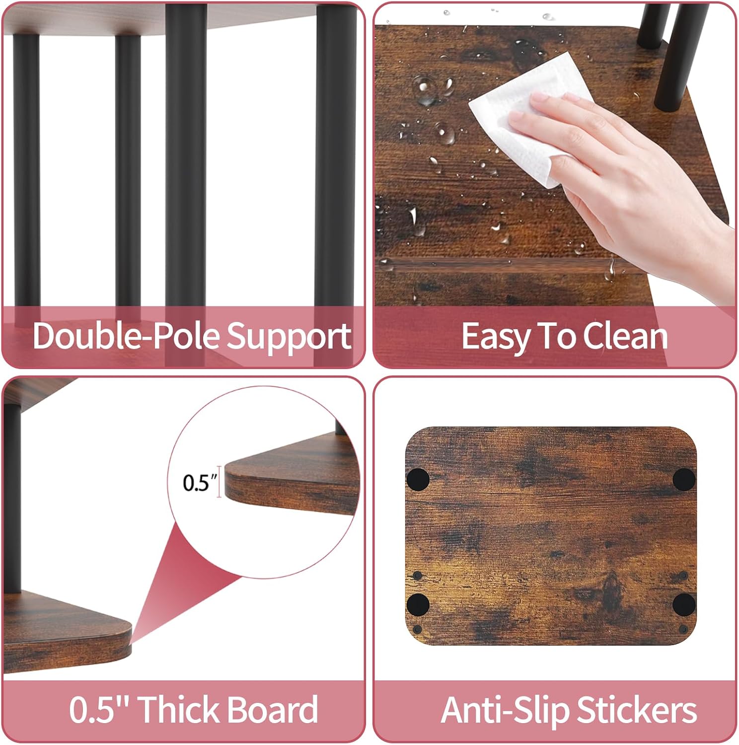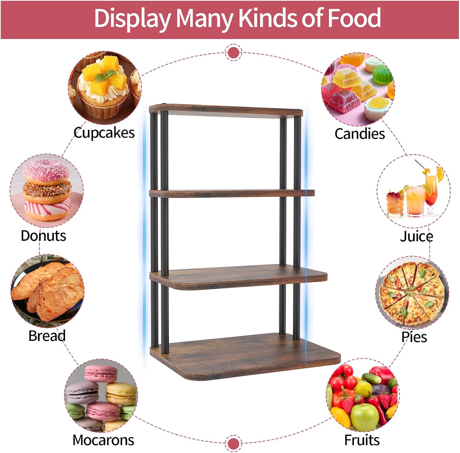 • Non-slip and Stable Tiered Dessert Stand Tower: Iron & wood grain paired with matte finish, 0.5" Thick MDF Base + 4 Support Rods and the cake stand equipped with a non-slip bottom pad, this cupcake stand stays firmly in place, preventing any sliding or tipping. Whether you're hosting a casual gathering or a big celebration, your cupcakes will stay secure and beautifully displayed.
