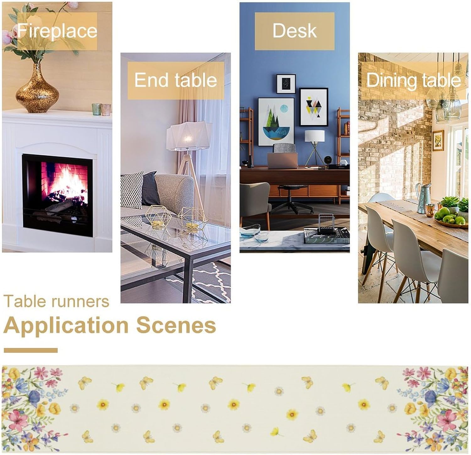 Flower Table Runner, Colorful Watercolor Pink Flower Plants Nature Butterfly Table Runner for Kitchen Dinner Living Room Home Party, 13x60 Inch