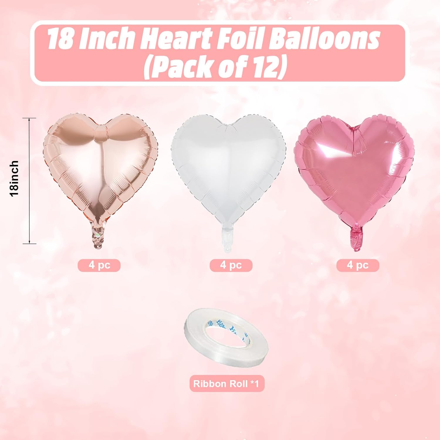 • Charming Pink White Rose gold Heart Balloons: Elevate your celebration with our set of 12 heart-shaped pink and rose gold balloons, each measuring 18 inches. Accompanied by a ribbon, these balloons are ideal for creating a festive and loving atmosphere at any special event.