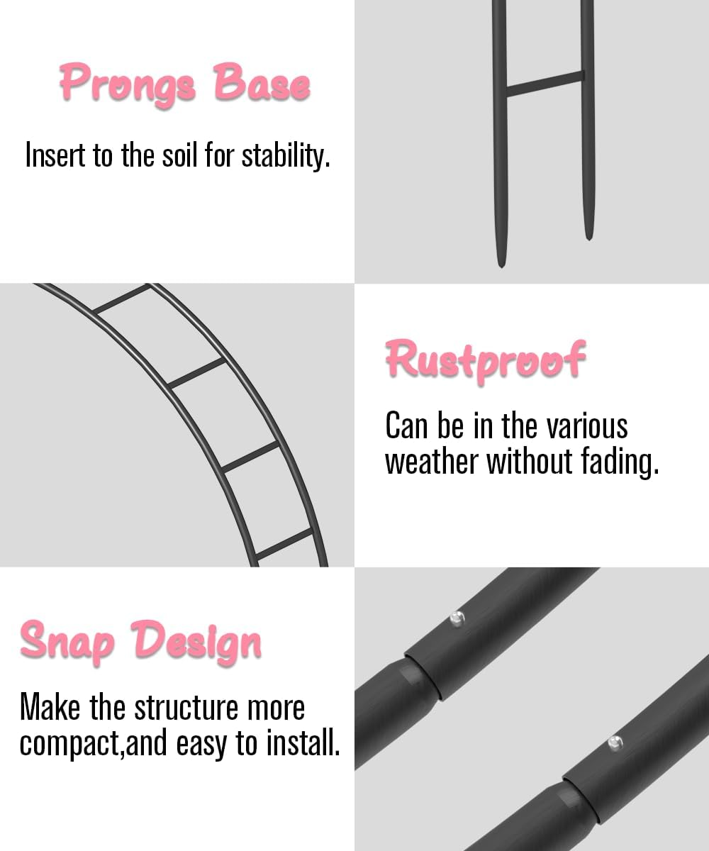 • Double-Tubes Construction: This garden arch features a robust double-tube structure with a sturdy base, ensuring exceptional stability and balance. The snap design contributes to a more compact and durable construction, making it suitable for both indoor and outdoor applications.