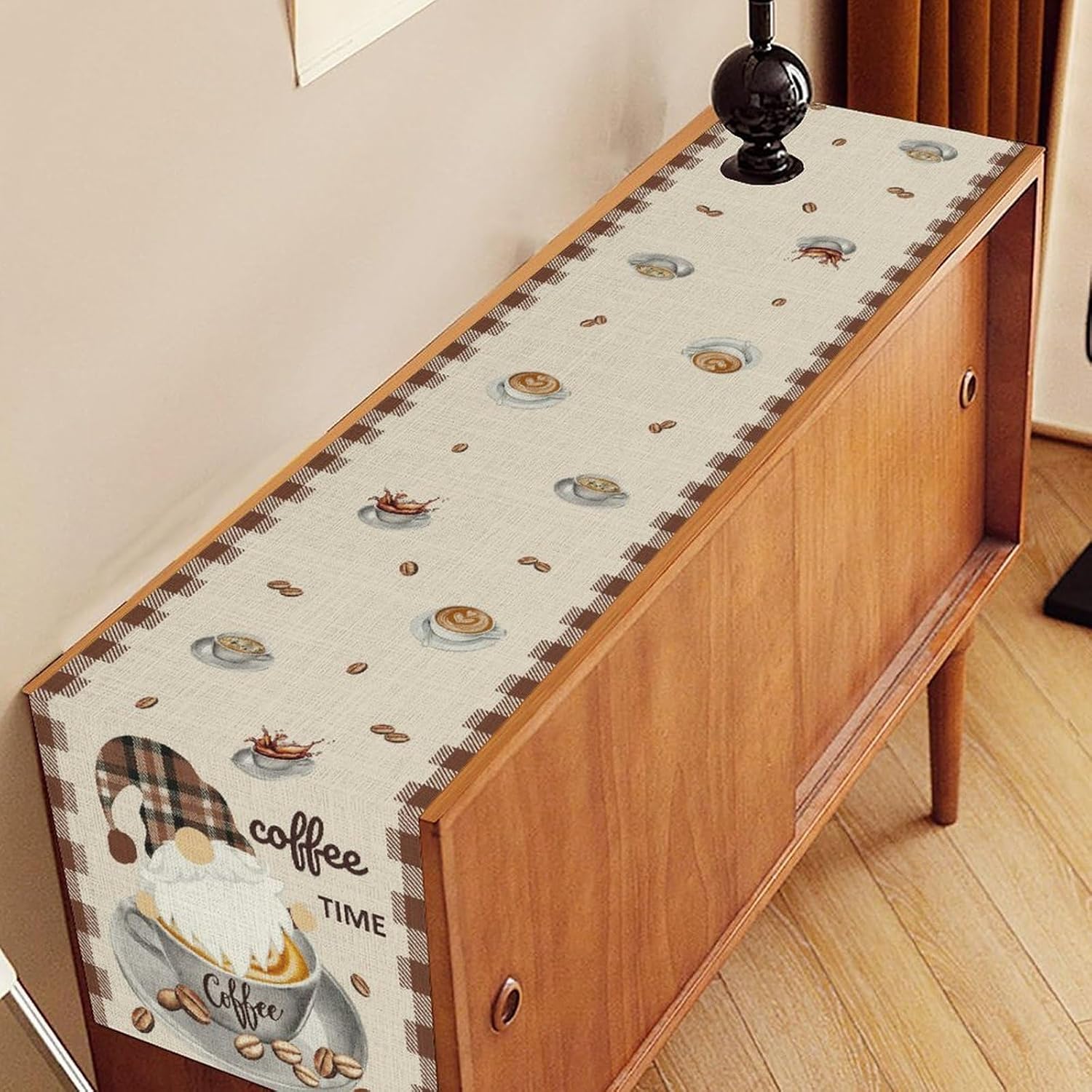Coffee Time Table Runner, Farmhouse Retro Gnome Coffee Cup Tea Party Cafe Table Center Decor for Home Kitchen Dining Patio Holiday Party Indoor Outdoor Table Decorations,13"x72" Inch