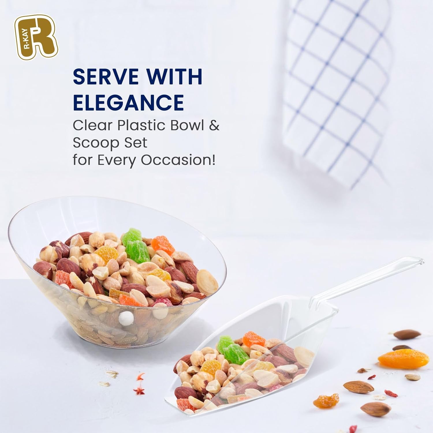 • FULL CANDY BAR DISPLAY SET: This set includes all you need to host your next party it includes premium clear disposable bowls and plastic scoop for ice, and it can be used for all kind of foods as candies, nuts, fruits, popcorn, snacks etc.