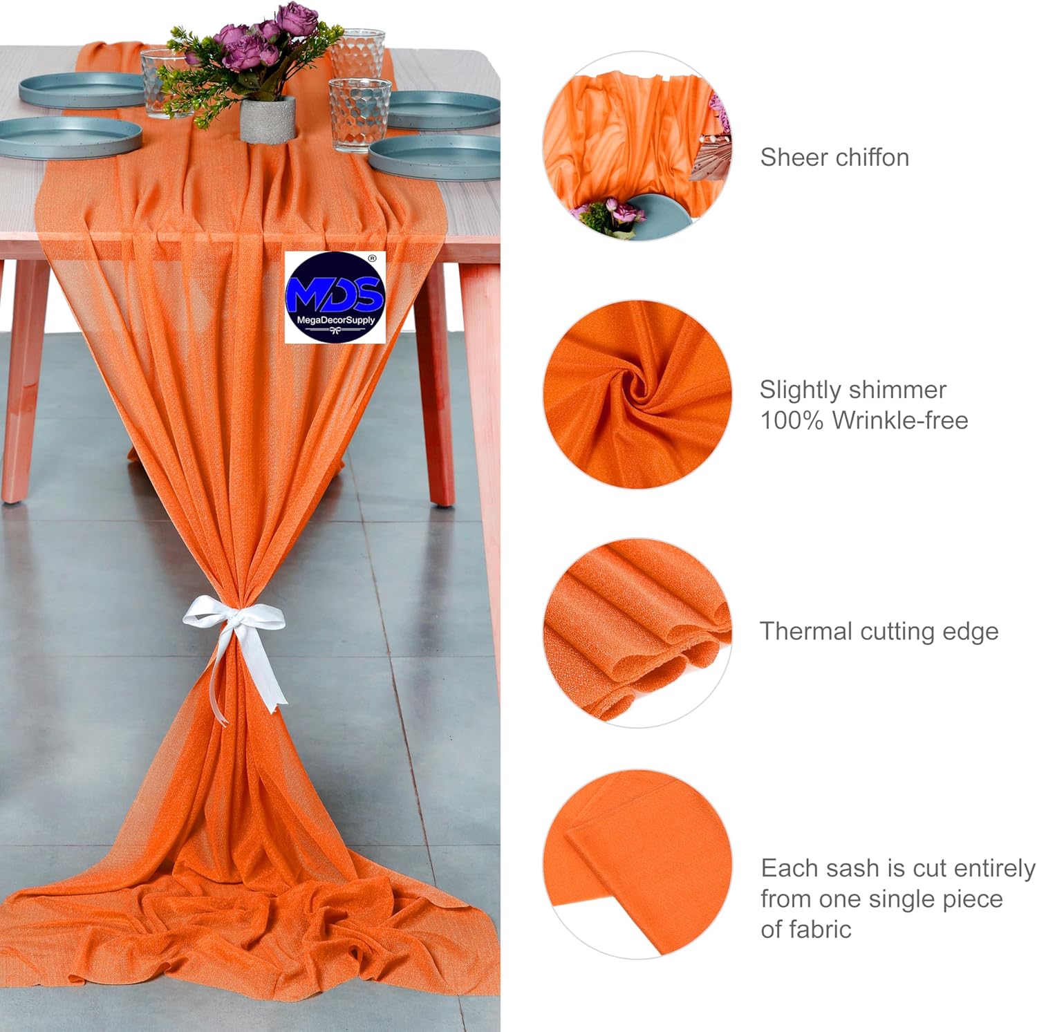 • Quantity : 2 PCS Chiffon Runner + 4 PCS white satin ribbon ties. Ribbon ties are included for gathering soft luminous folds looking at both ends. Or you may just let it drapes gracefully across your table and flows onto the floor in dreamy pools of fabric.