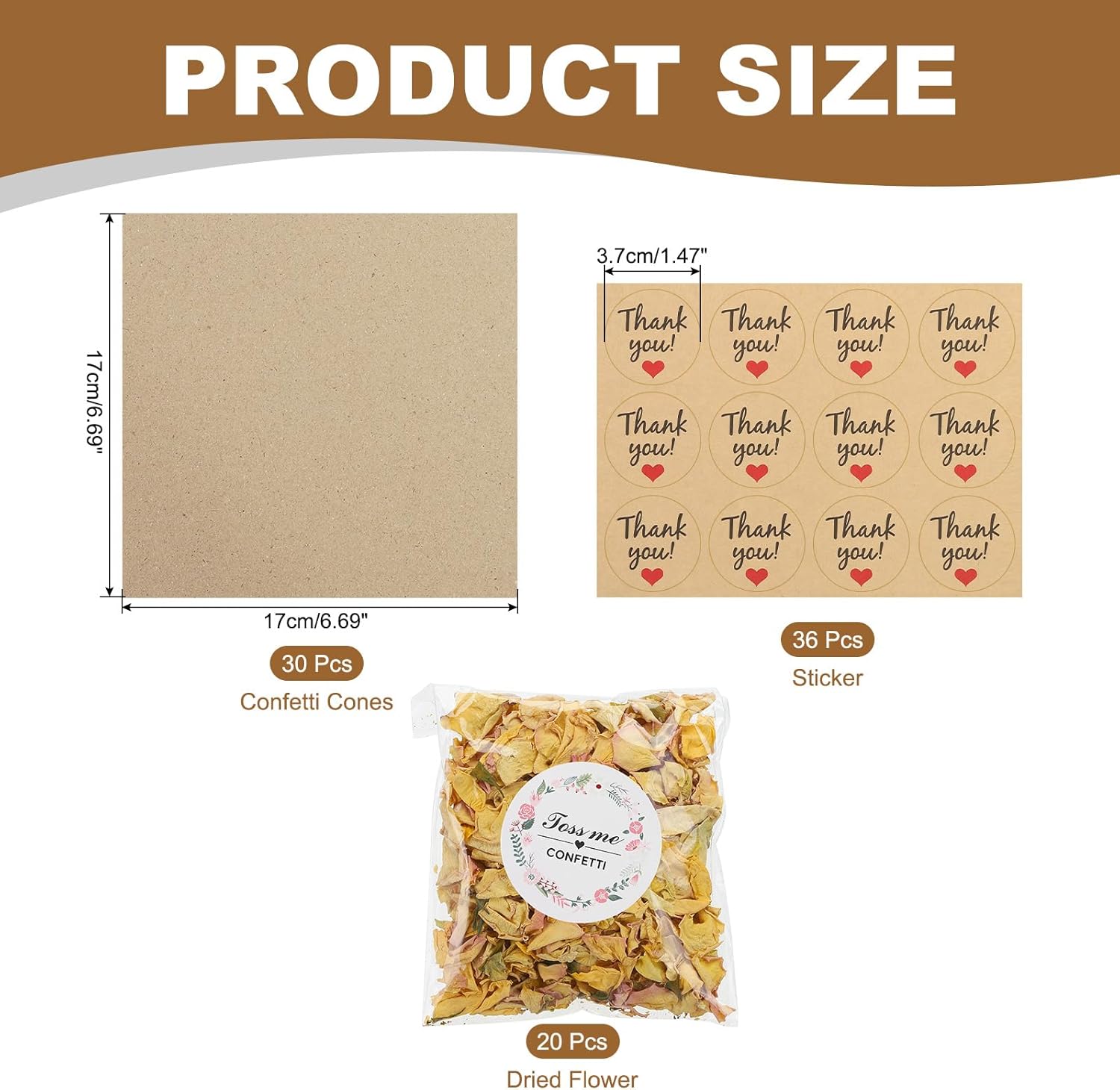 • Material: Paper; Color: Light Yellow/Pink; Paper Cone Size: 17 x 17 cm / 6.69 x 6.69 inch (LxW); Sticker Diameter: 3.7 cm / 1.47 inch; Dried Flower Weight: 160 g / 3.4 qt / 5.75 oz; Package List: 30 Pcs x Confetti Cones, 20 Pcs x Dried Flower, 36 Pcs x Sticker