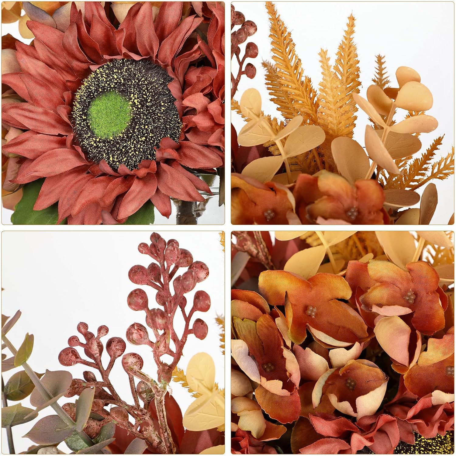 • Mason Jar Centerpieces - This fall centerpieces for tables features lifelike orange red sunflowers with green centers, complemented by green foliage, burnt orange hydrangeas, eucalyptus leaves, and natural textured wheat stems. Each silk petal showcases delicate veining for authentic realism. The sunflower bouquet is securely placed in a classic glass mason jar, creating a perfect farmhouse autumn centerpiece for Thanksgiving, harvest festivals, or seasonal home styling