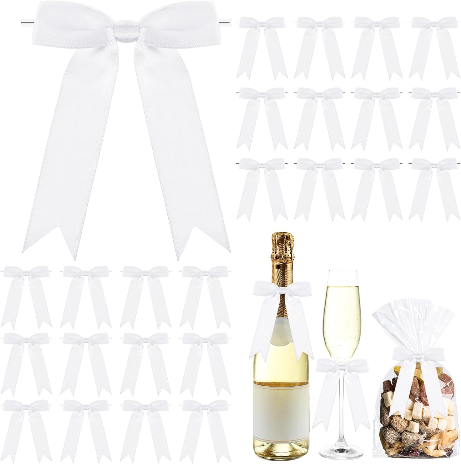 • White Twist Tie Bows: our package includes 24 white ribbon bows and 24 twist ties; This set will easily meet your various needs for decoration or DIY projects; The dimensions of our bow are approximately 3.5 x 5 inches/ 9 x 13 cm, with a ribbon width of 1 inches/ 2.5 cm; The decent size is suitable for decorating gifts, packages, and other items; You can have fun with family and friend making eye catching decorative pieces by DIY