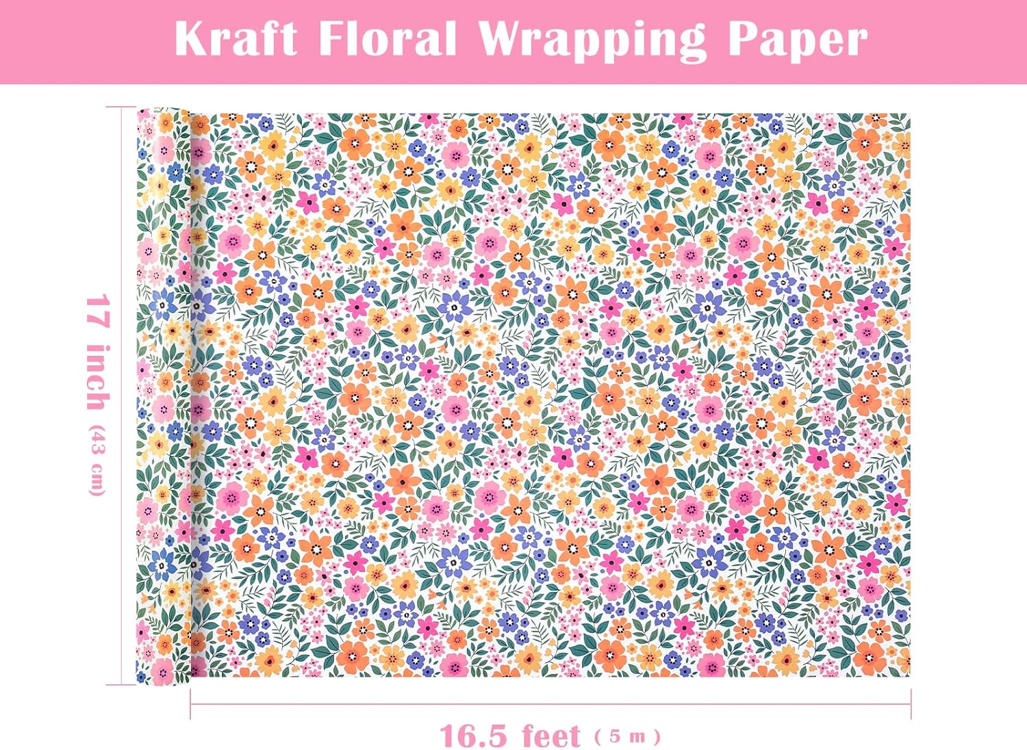 WRAPAHOLIC Kraft Floral Wrapping Paper Roll - Mini Roll - 17 Inch x 16.5 Feet - Ditsy Flower Wrapping Paper, Perfect for Wedding, Birthday, Bridal Shower, Tea Party