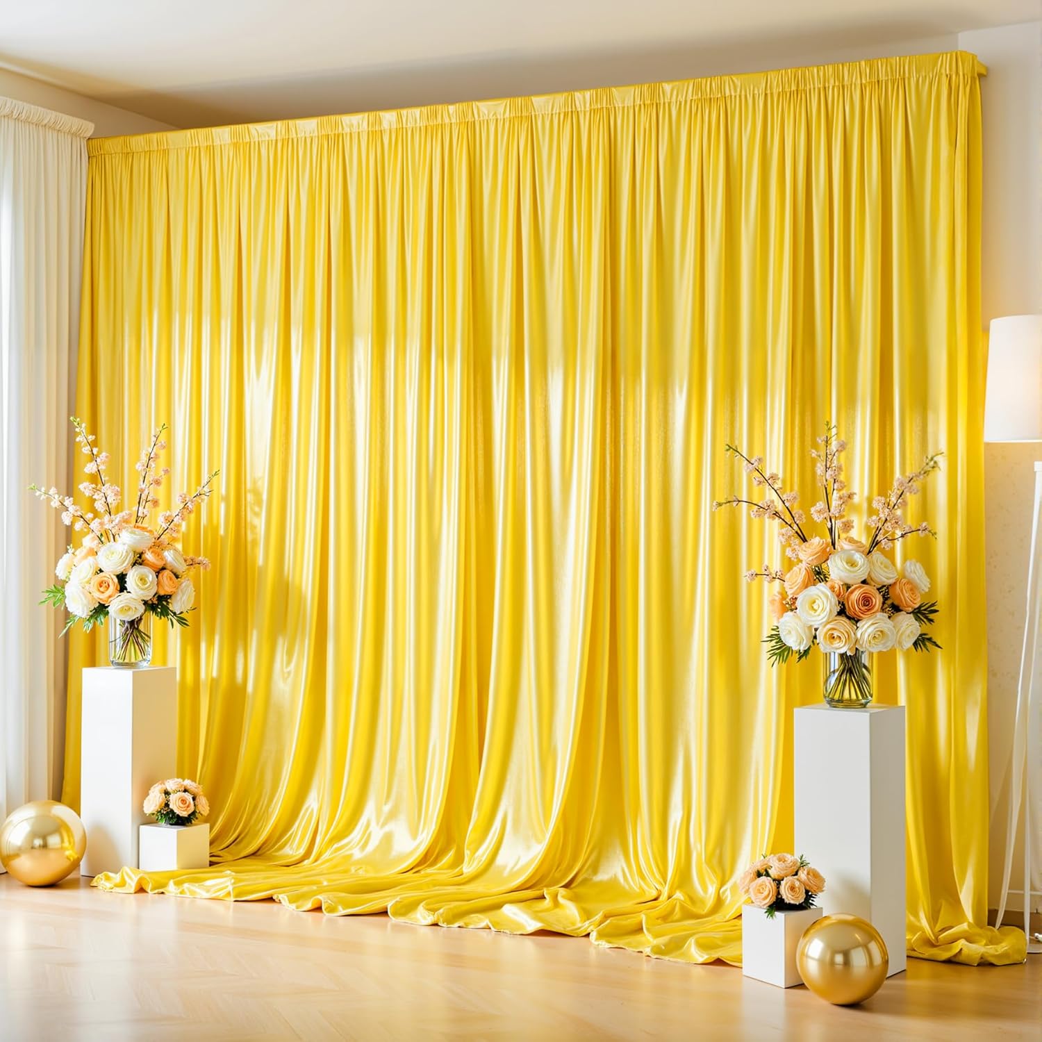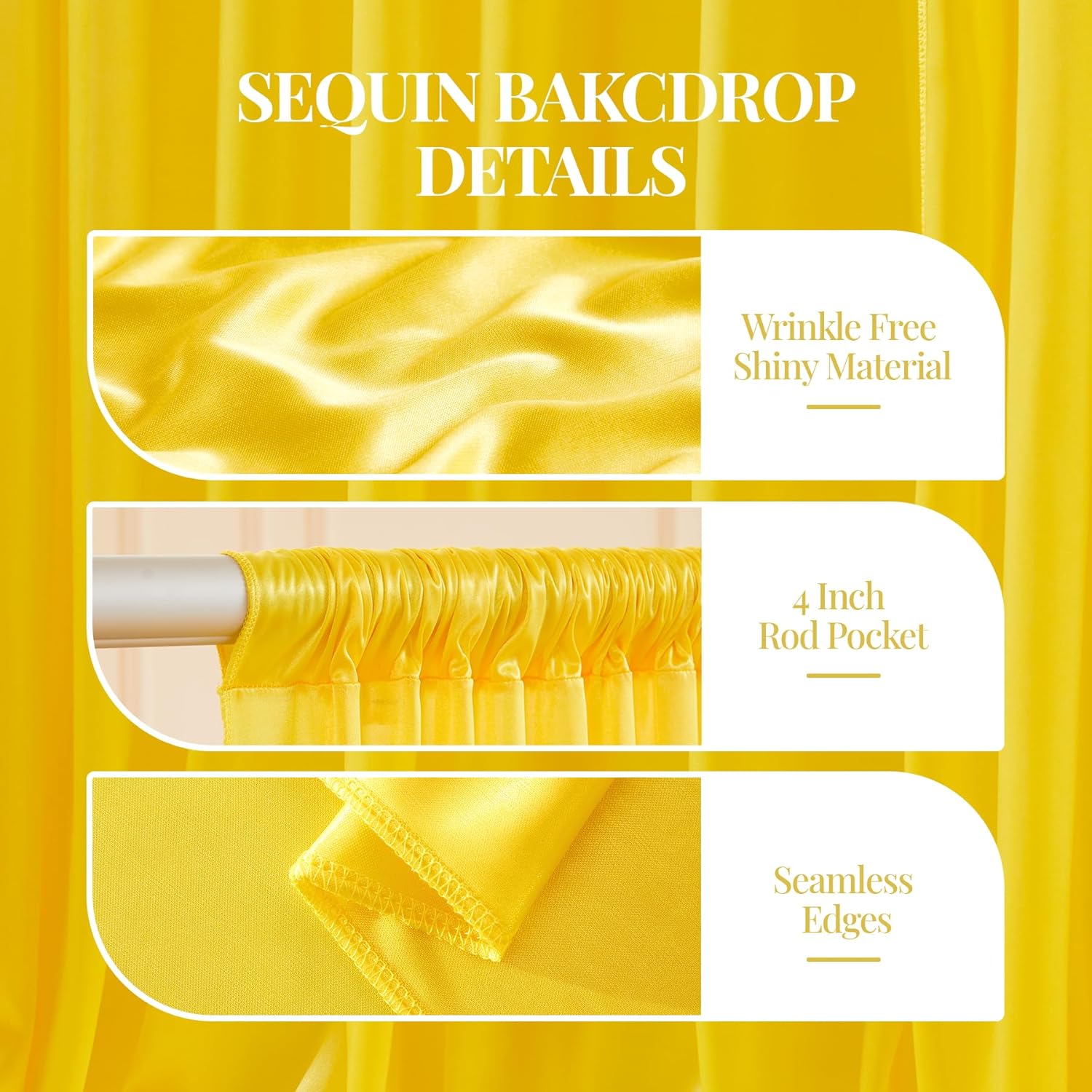 • 【Stunning Yellow Satin Curtains Material】Our sparkly backdrop curtains panels are super shiny and catch the light beautifully. But the product name there are no actual sequins on these curtain panels, the backdrop drapes is a really soft satin fabric with glitter/sparkles that gives it a nice texture. They are wrinkle free, and nothing will fall off of it. It's perfect for the backdrop for any party and they will be able to elevate the look of your decoration.