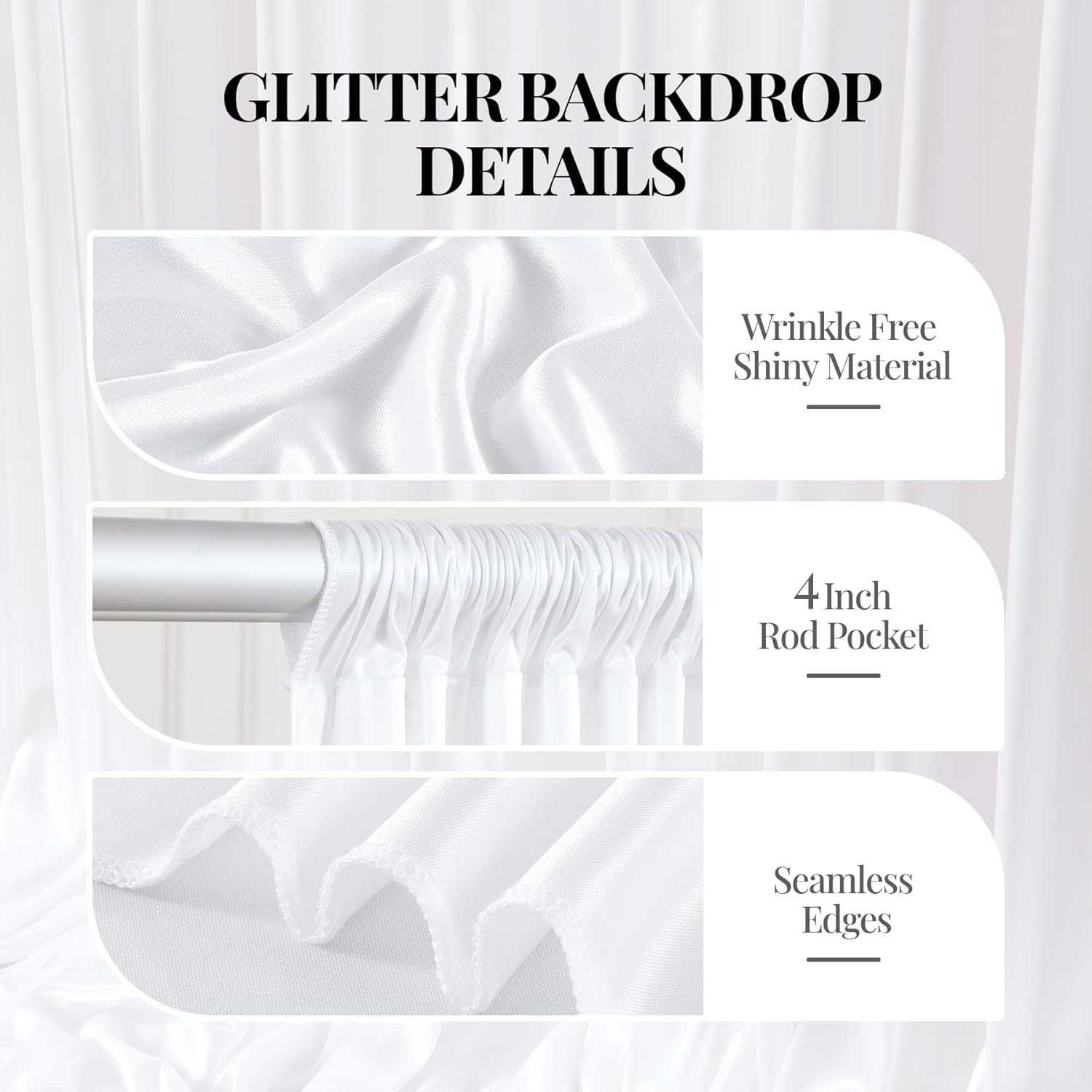 • 【Stunning White Satin Curtains Material】Our sparkly backdrop curtains panels are super shiny and catch the light beautifully. But the product name there are no actual sequins on these curtain panels, the backdrop drapes is a really soft satin fabric with glitter/sparkles that gives it a nice texture. They are wrinkle free, and nothing will fall off of it. It's perfect for the backdrop for any party and they will be able to elevate the look of your decoration.