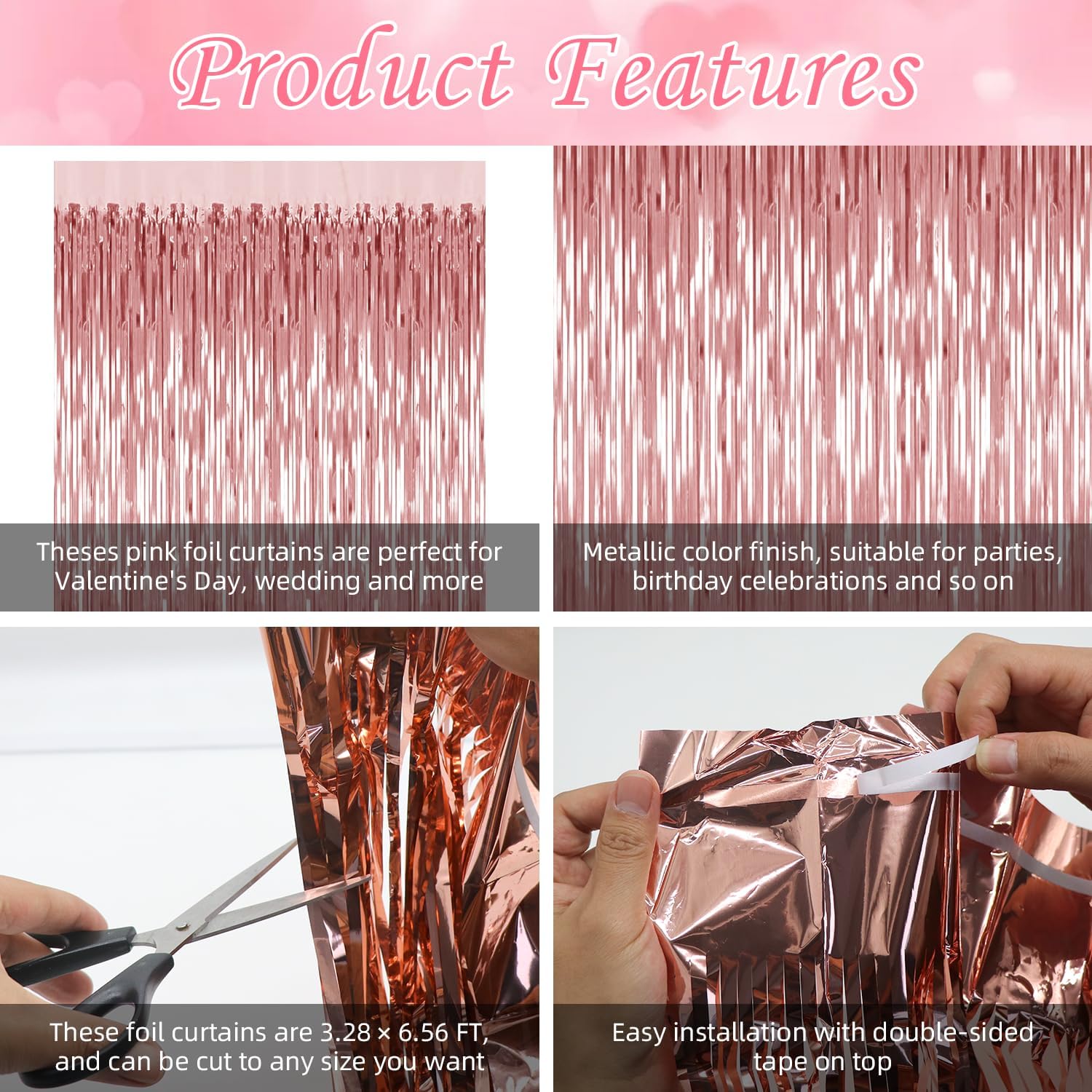 • Rose Gold Birthday Backdrop:3 packs of foil fringe curtains, the size of the foil curtain is 3.28 ft x 6.56 ft.It's long enough to fit any occasion. Please do not stick the foil curtain on uneven or stained walls to prevent it from falling off.