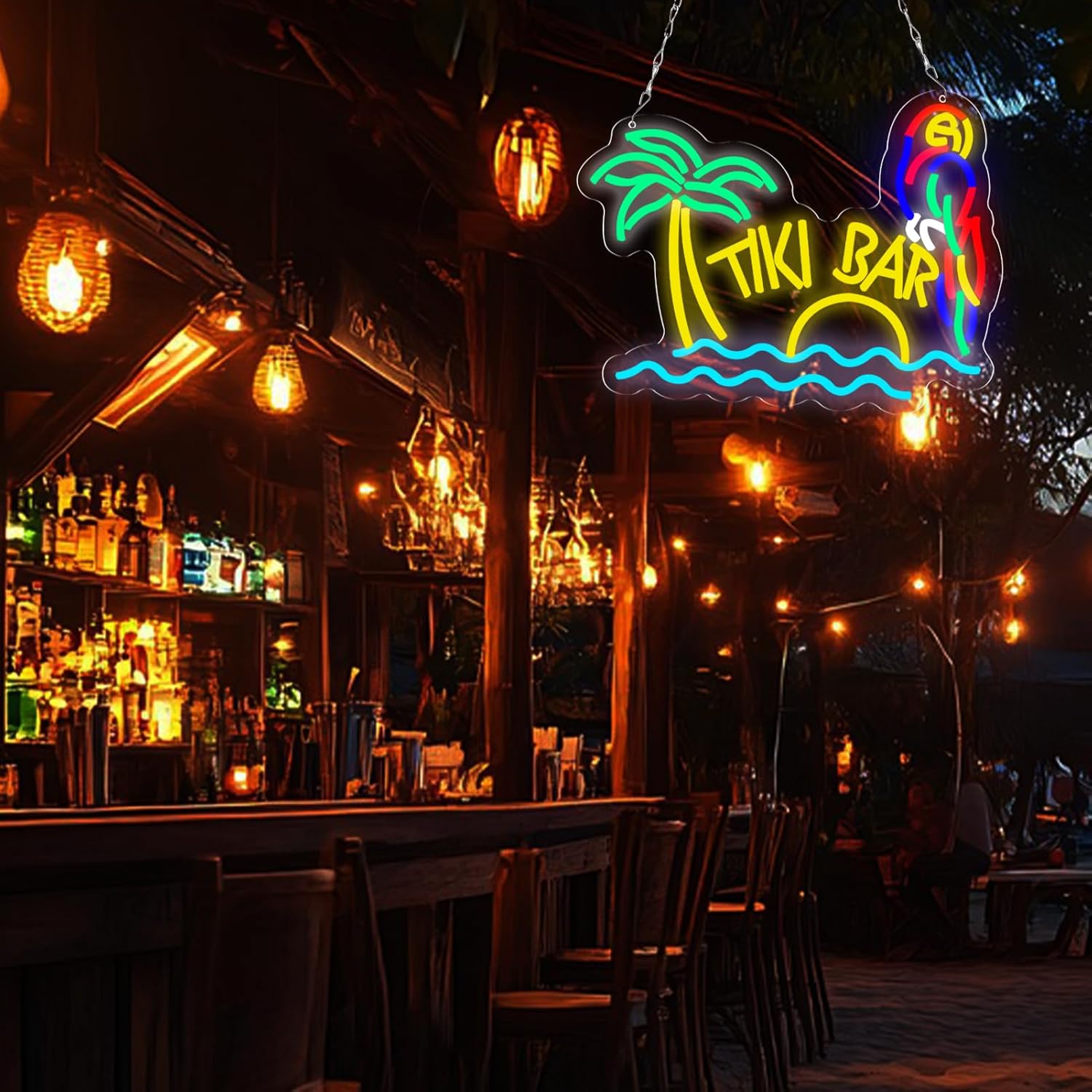 • ๐‘ฝ๐‘ฐ๐‘ฉ๐‘น๐‘จ๐‘ต๐‘ป ๐‘ซ๐‘ฌ๐‘บ๐‘ฐ๐‘ฎ๐‘ต: Colorful LED neon style tiki bar sign features palm trees, ocean waves and parrots in bright tropical colors, perfect for beach themed decor.