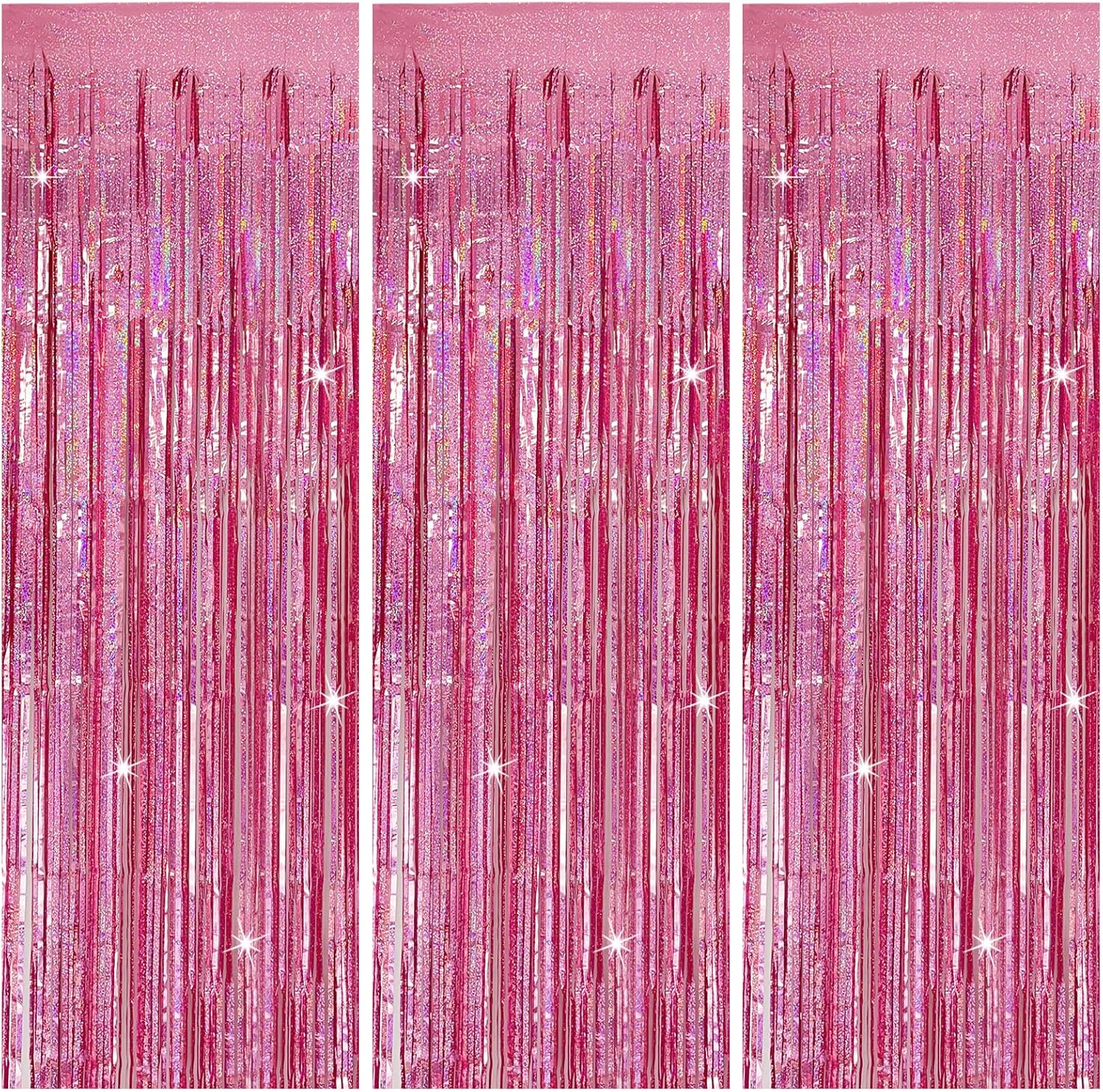 • Pink Decorations for Party:3 packs of foil fringe curtains, the size of the foil curtain is 3.28 ft x 6.56 ft.It's long enough to fit any occasion.Please do not stick the foil curtain on uneven or stained walls to prevent it from falling off.
