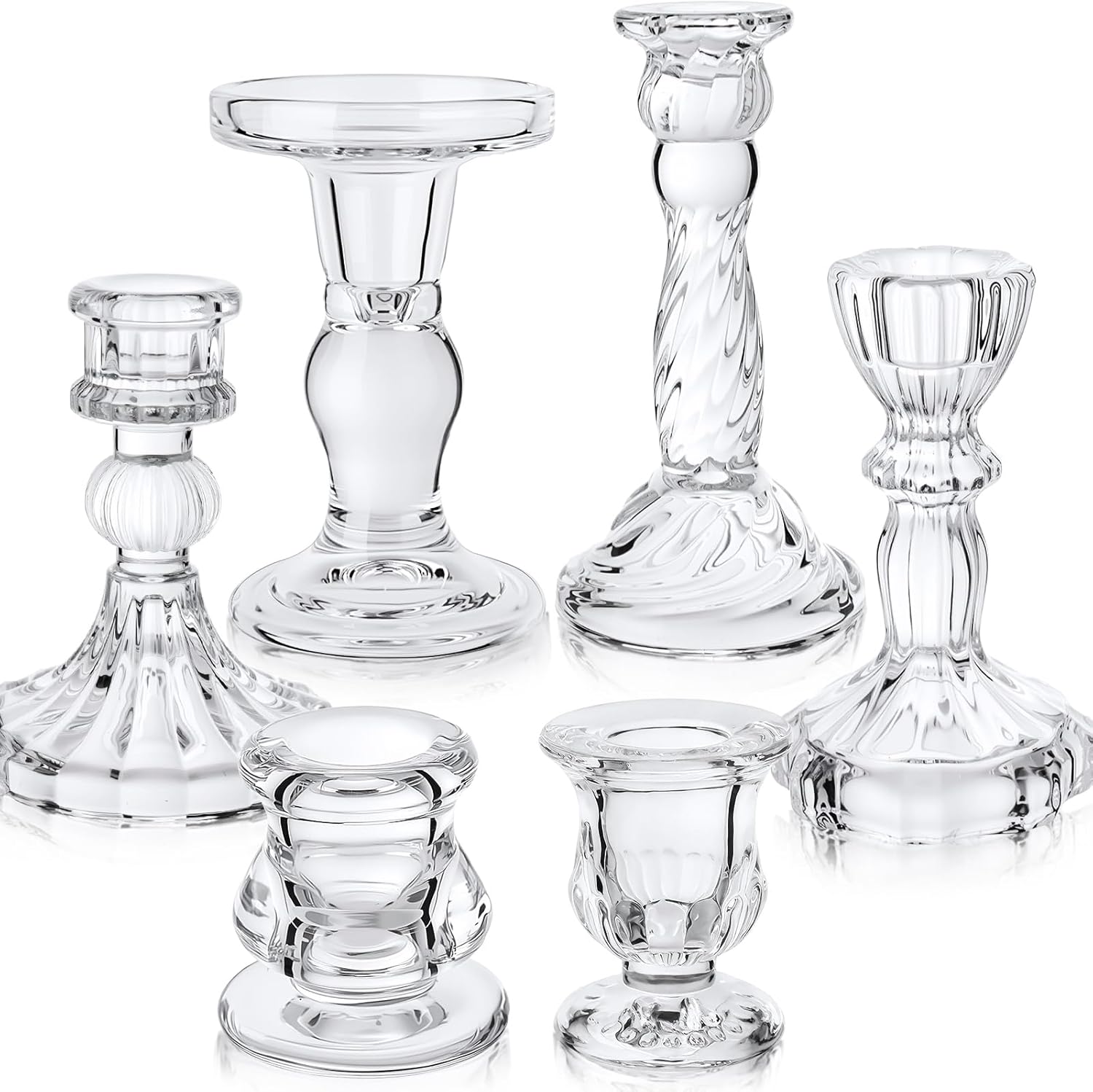 • Package Contents: you will receive 6 pieces 6 style glass candle holders in different sizes, which have different heights, smooth shapes and smooth finishes; The candlestick holder add a clean, simple, and elegant aesthetic to any space, it is suitable for a variety of candles