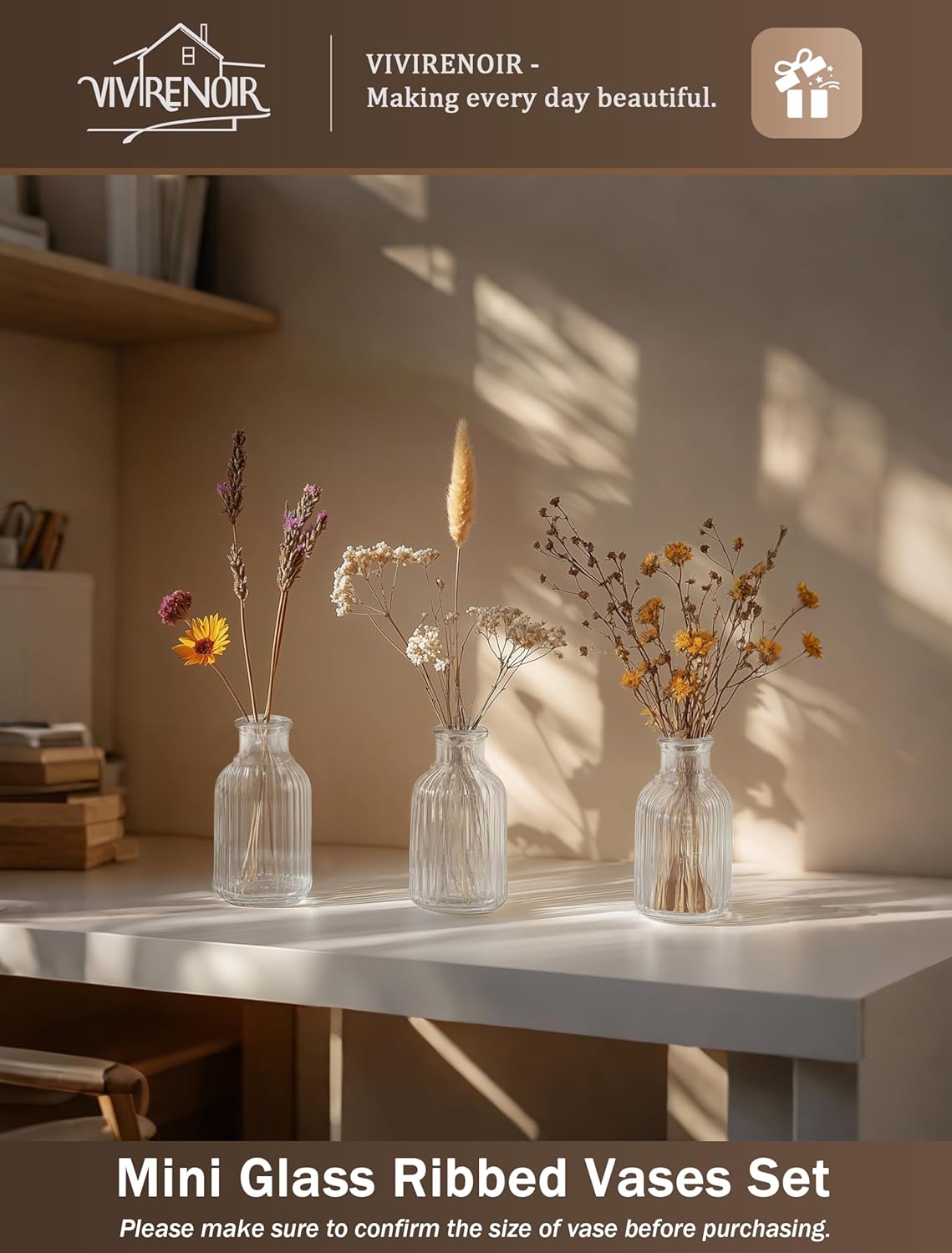• Modern Mini Vases: Crafted at 3.82" (9.7cm) H, these glass vases feature a textured ribbed design that adds an elegant, vintage-inspired charm to any space. Perfect for boho table centerpieces, they effortlessly blend minimalist aesthetics with versatile functionality—ideal for small flowers.