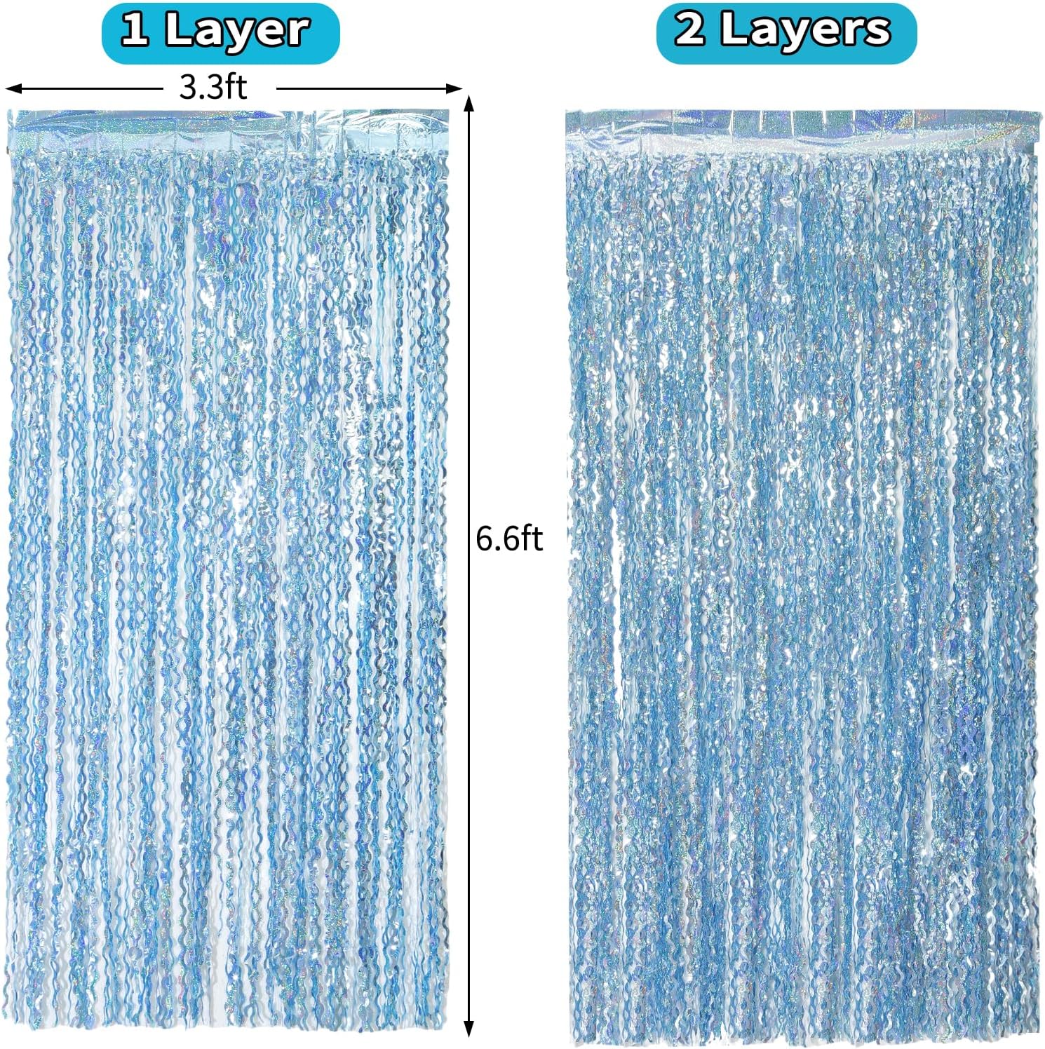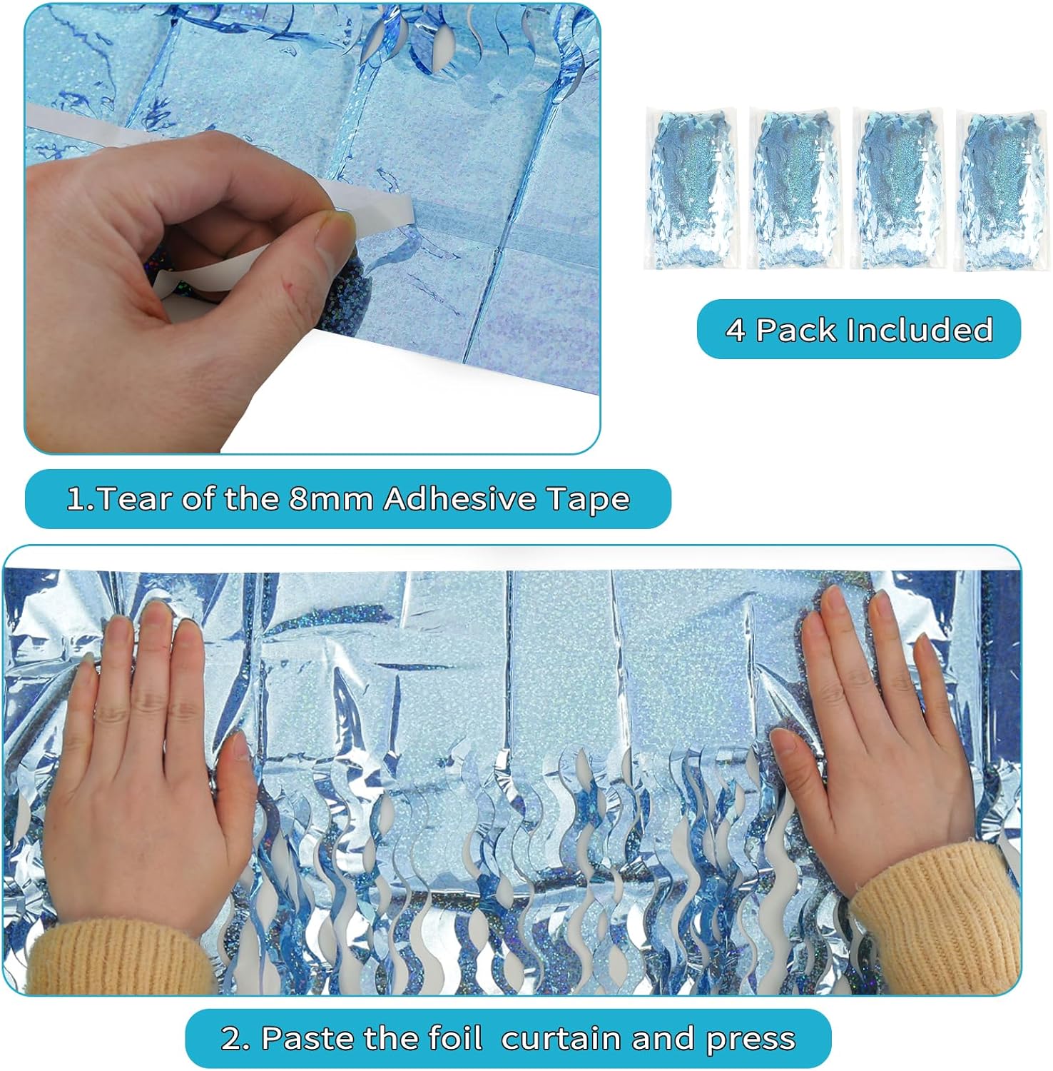 4 Pack Wavy Blue Tinsel Backdrop Streamers Party Decorations 3.3x6.6 Feet | Foil Fringe Curtain Ocean Themed | Blue Birthday Decorations