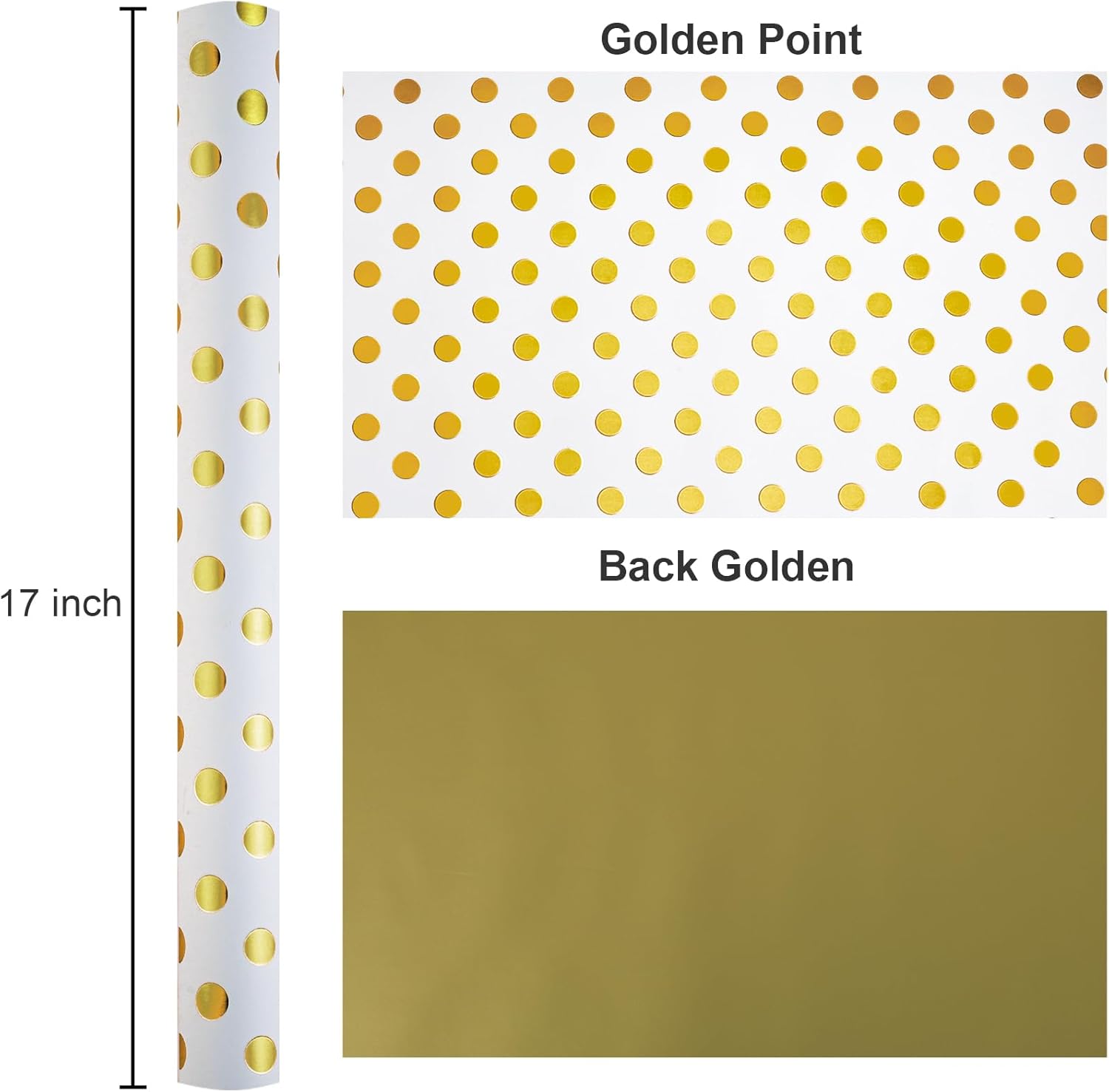 • Double-Sided Wrapping Paper: One side features white and gold polka dots, while the other is solid gold, adding a touch of sophistication