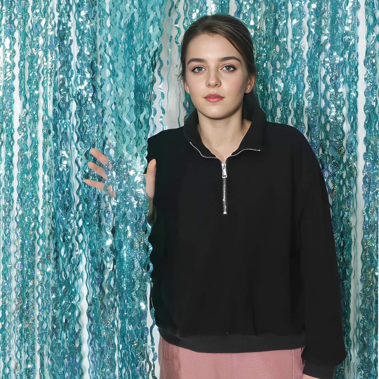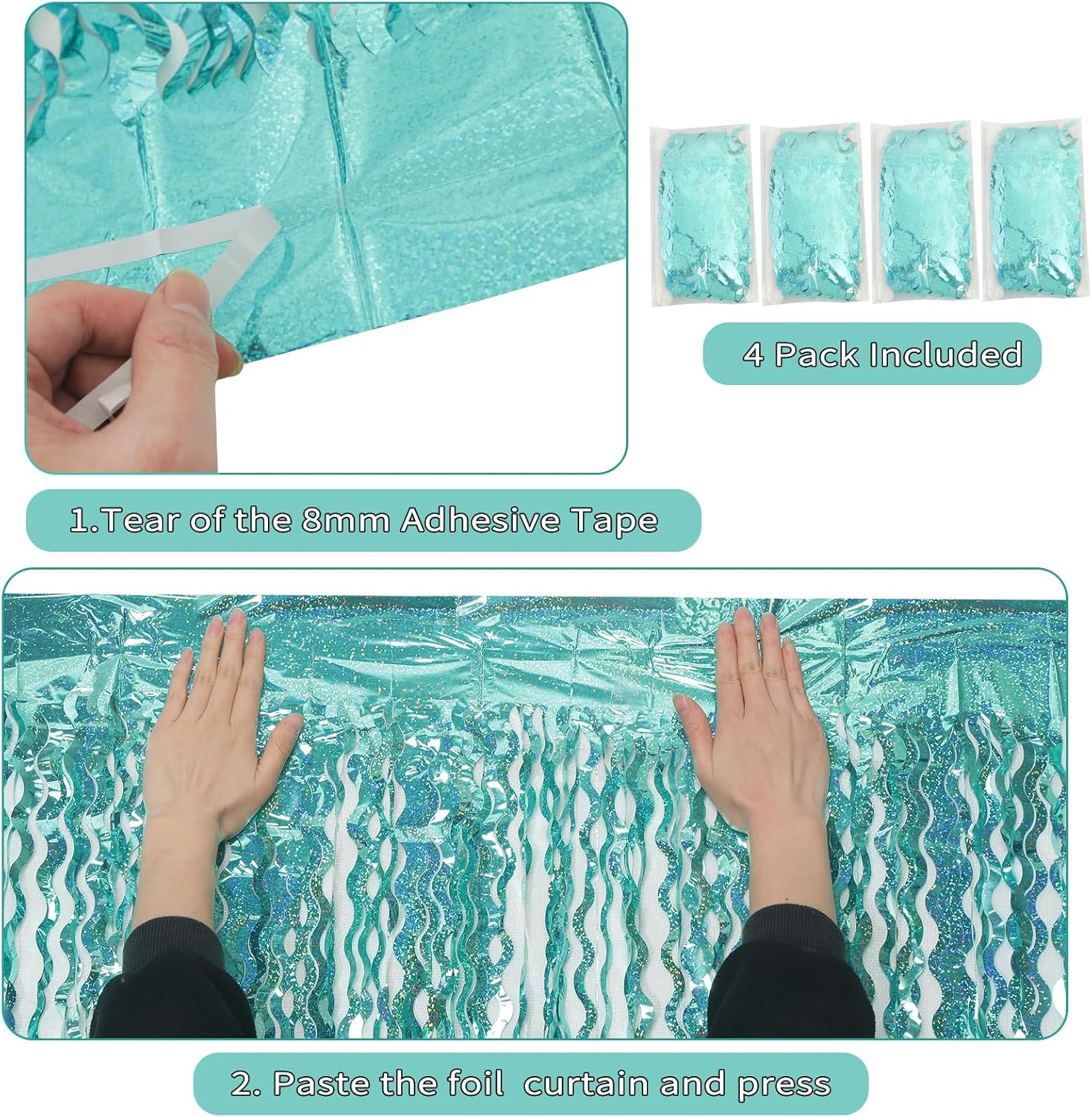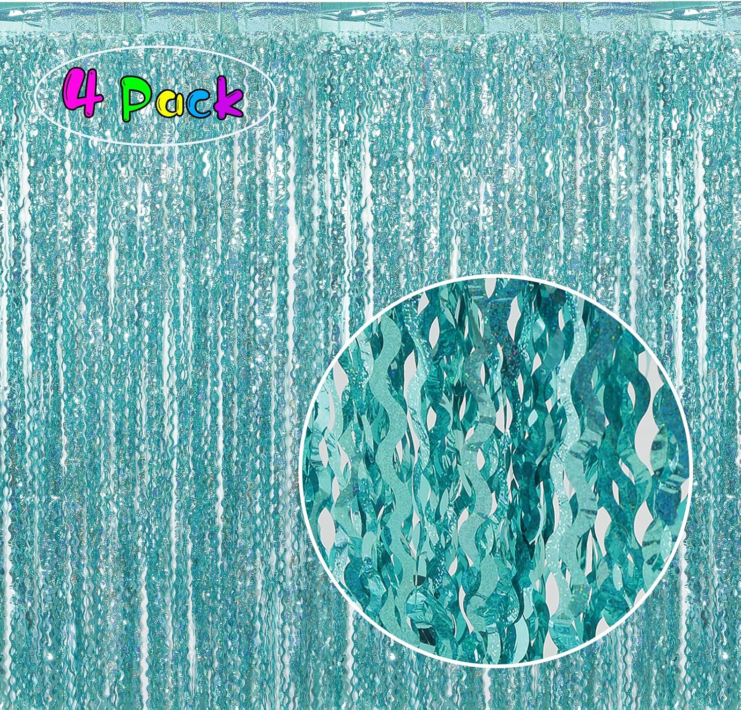 4 Pack 3.3 ft x 6.6 ft Wavy Sparkle Aqua Teal Blue Foil Curtain - Water Blue Foil Streamers for Holiday Bachelorette Ocean Themed Decor Winter Party Decorations Supplies