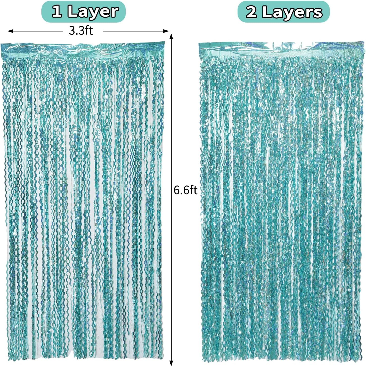 • Package Contents: 4 pack teal blue wavy foil fringe curtains,each curtain is 3.3ft x6.6ft,You can cut the metallic backdrop into the suitable length for use,Wonderful accessories for decorating doors and walls