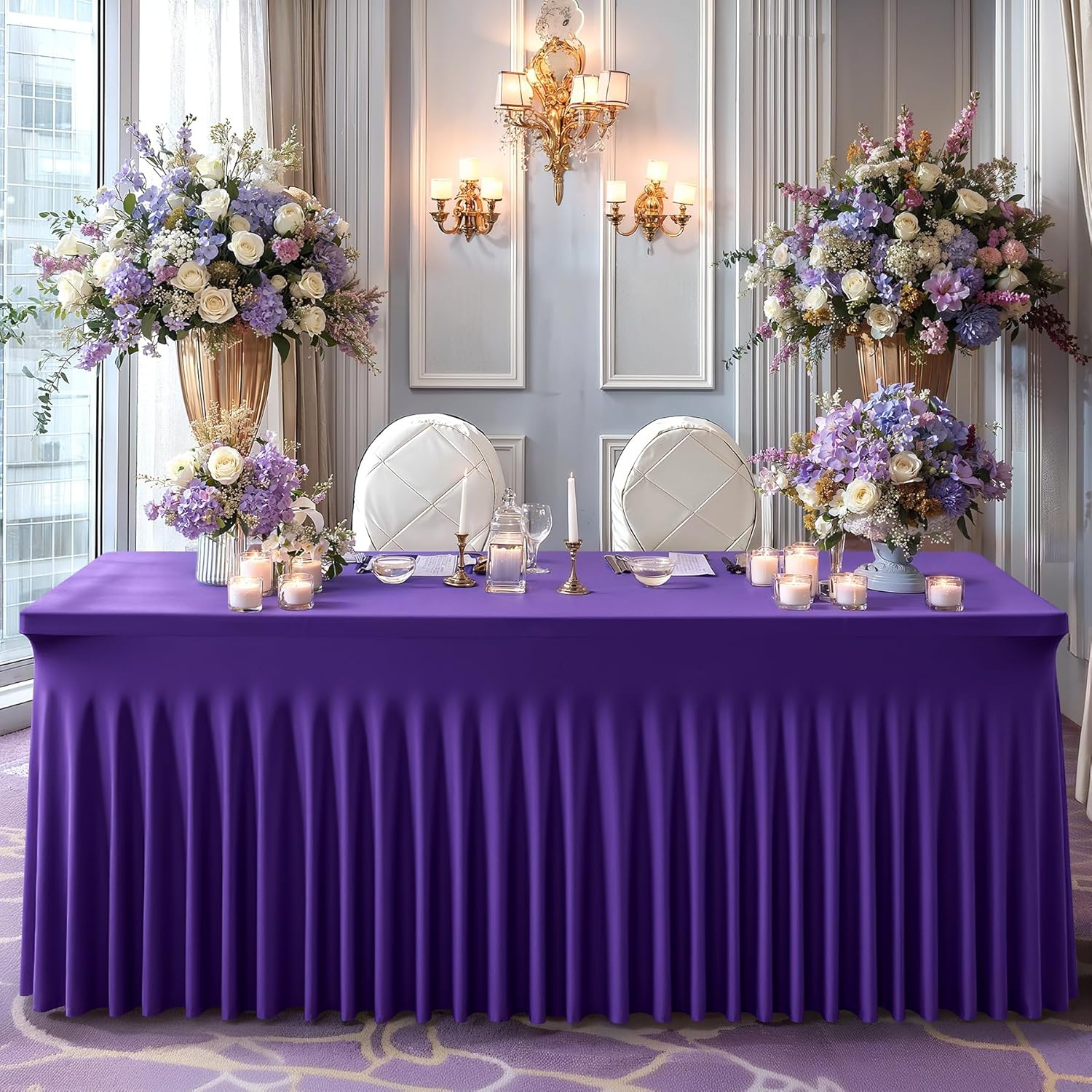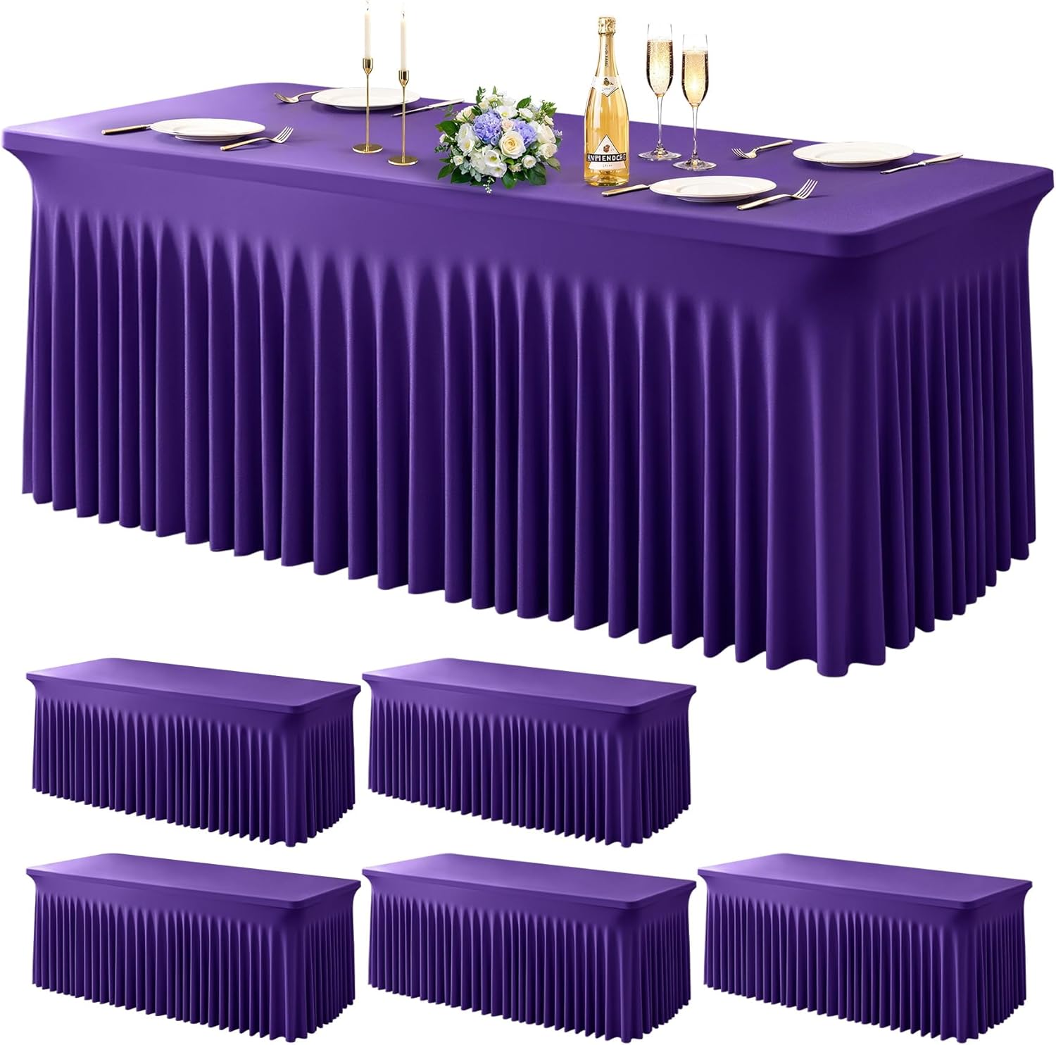 Wish Care 6 Pack Dark Purple Spandex Table Clothes for 8 Foot Rectangle Tables, 8FT Wrinkle Free Fitted Tablecloths Ruffles Design Table Cover for Party, Banquet, Wedding and Events
