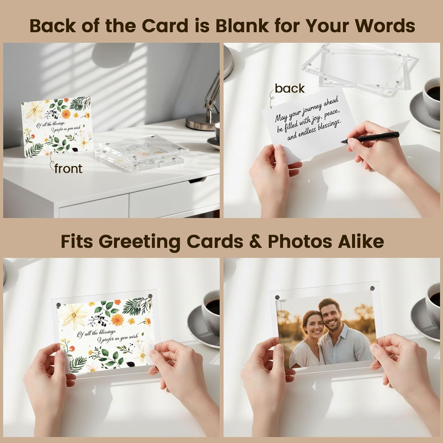 • Transparent Picture Frames Design - Thoughtful Small Item: Includes 2PCS picture frames, a cleaning cloth for dust removal, and a gift card for personalized messages. The double-sided transparent design blends seamlessly with minimalist, Nordic, and modern decor. Its clear acrylic creates a stunning floating photo effect, adding elegance and artistry to your space—perfect for displaying cherished memories