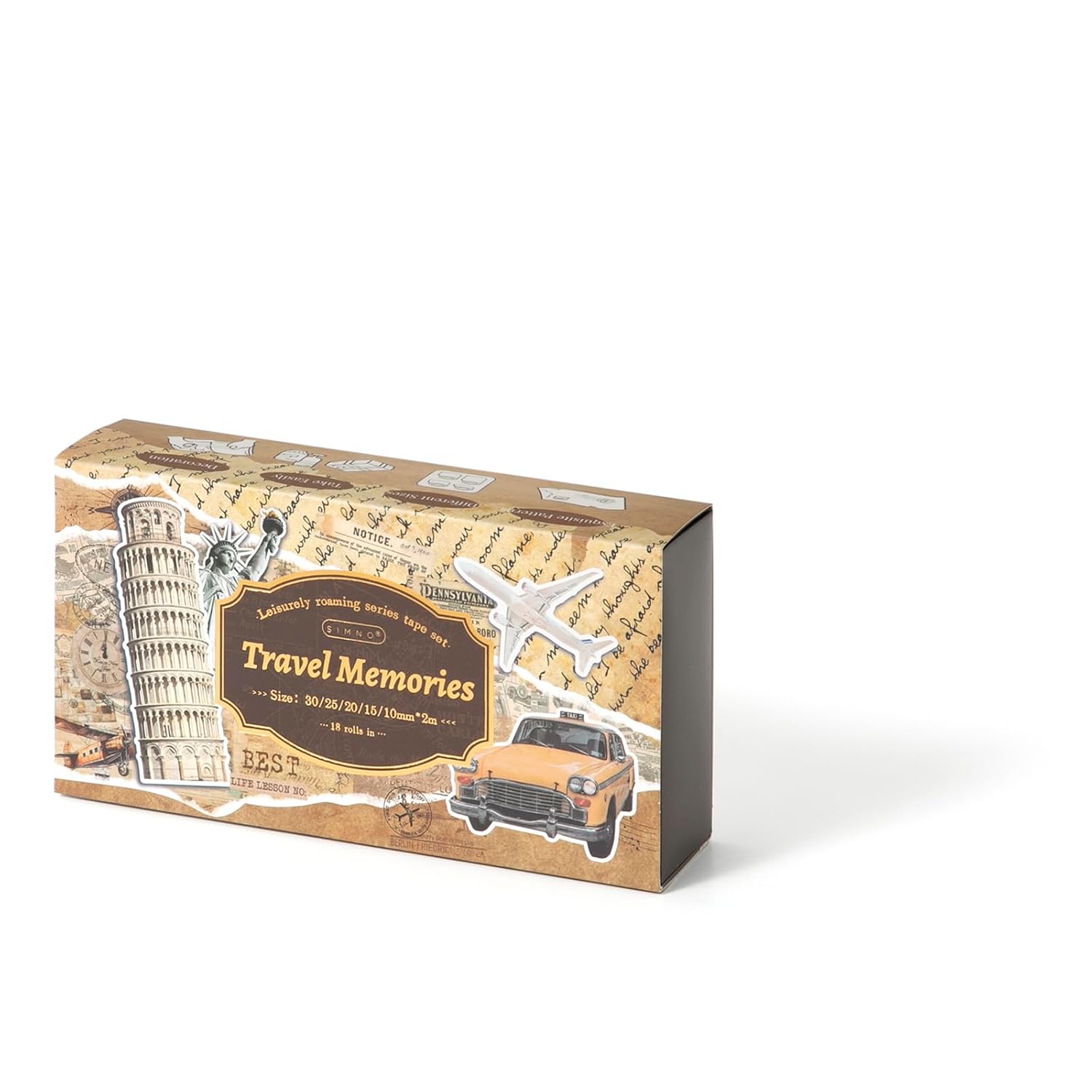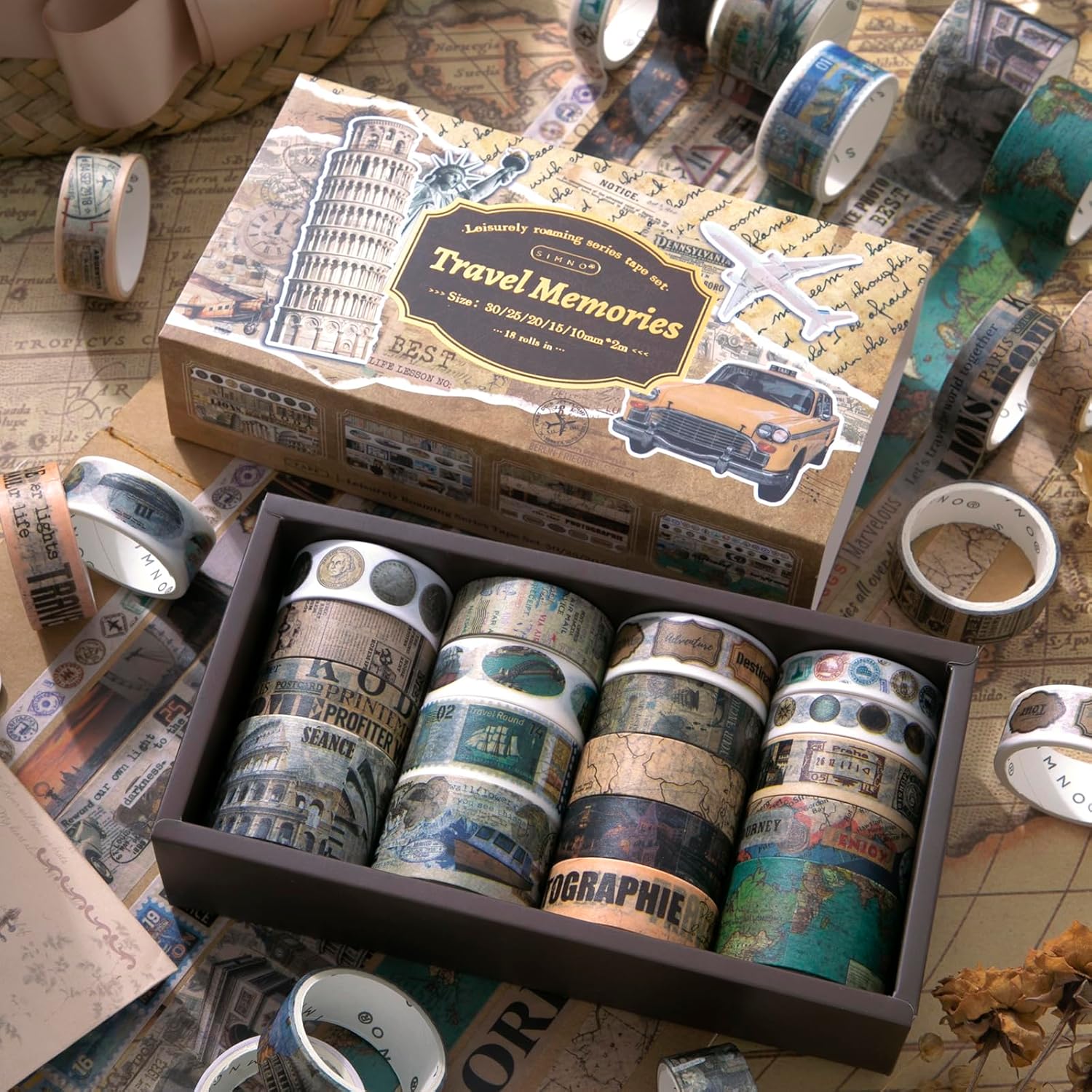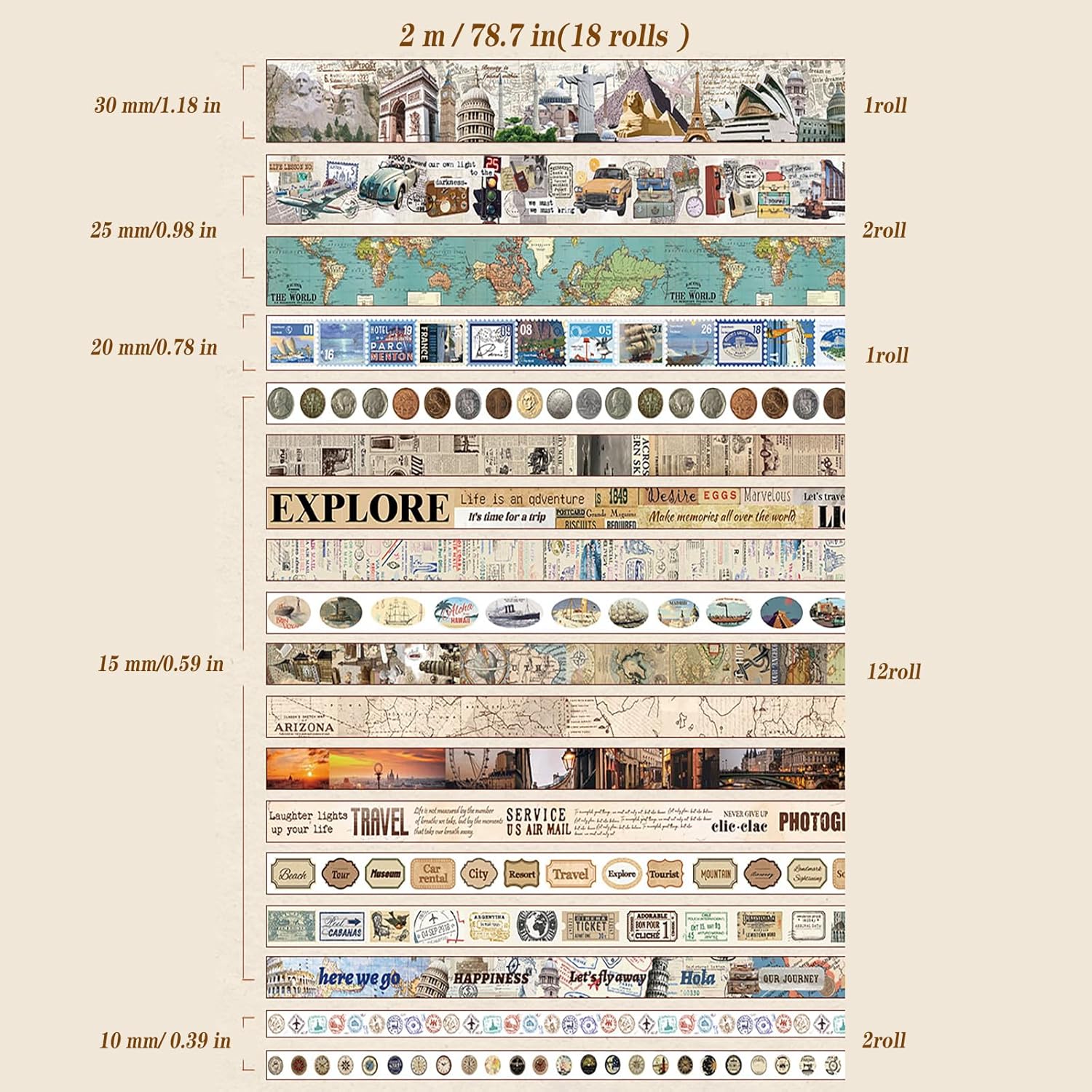 • Travel washi tape comes in a box with 18 rolls of high-quality washi tape in five sizes, including wide and thin washi tape. Each roll is 1.18 inches (30 mm) x 1 tape; 0.98 inches (25 mm) x 2 tapes; 0.78 inches (20 mm) x 1 tape; 0.59 inches (15 mm) x 12 tapes; 0.39 inches (10 mm) x 2 tape.