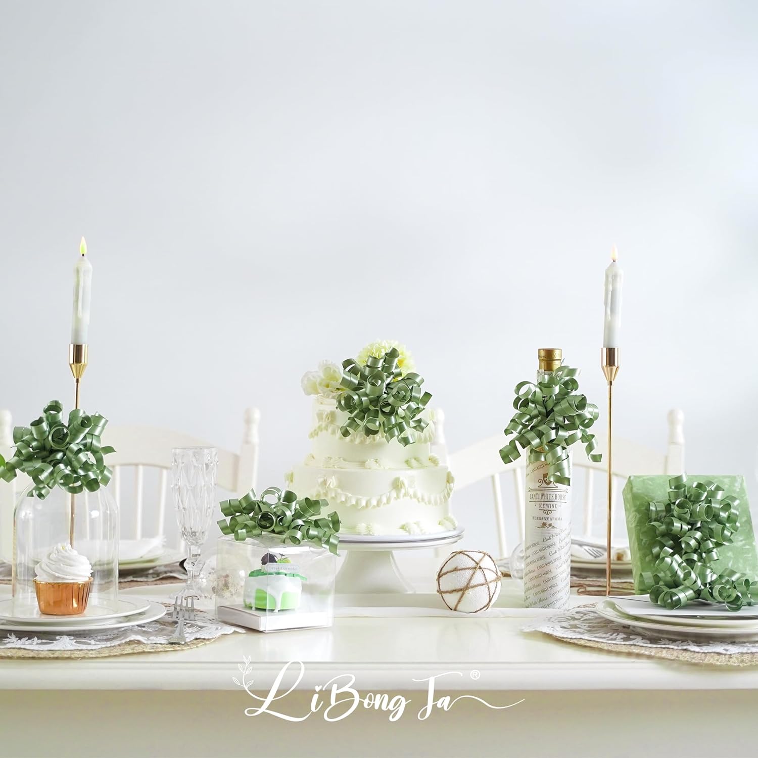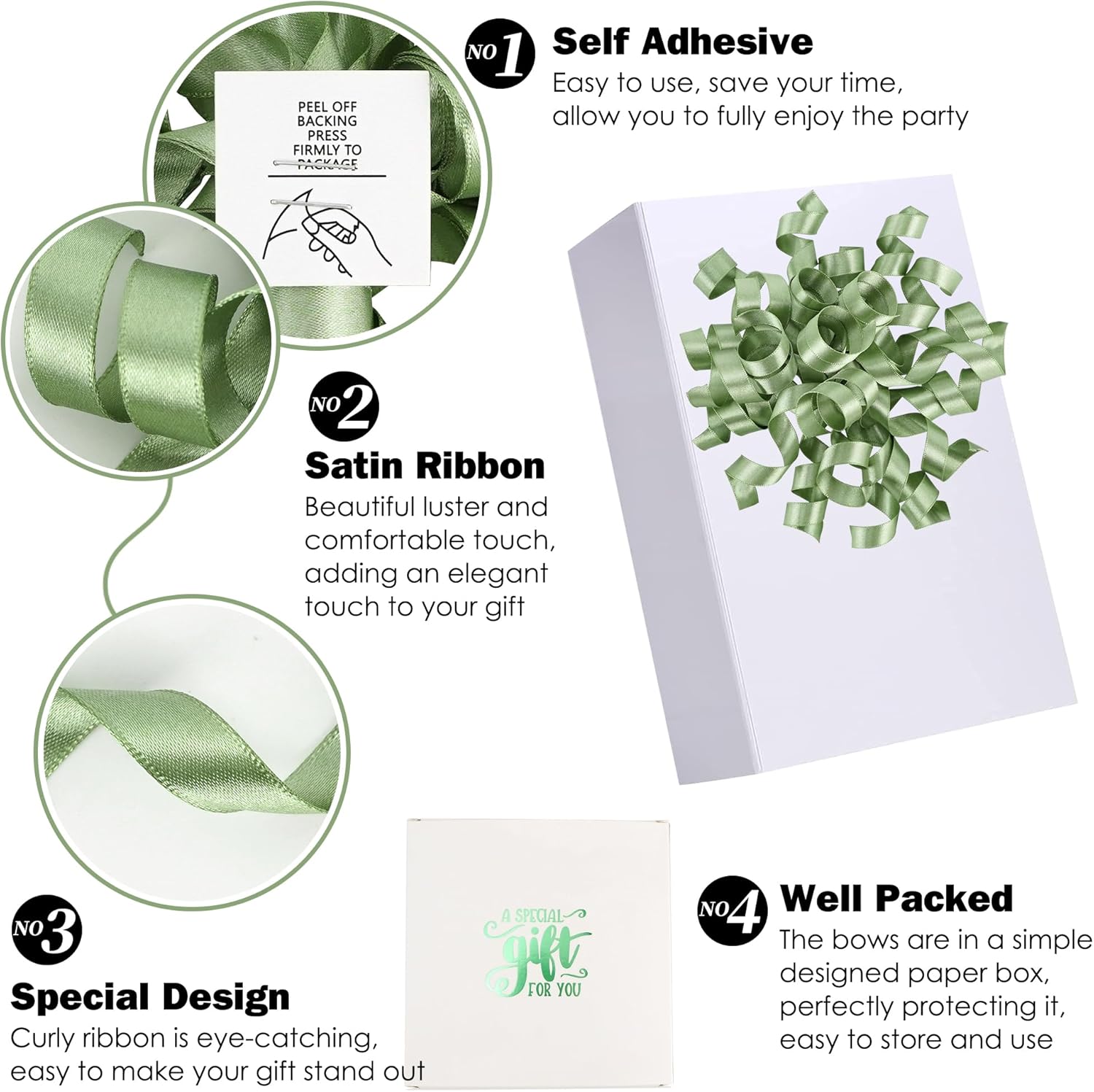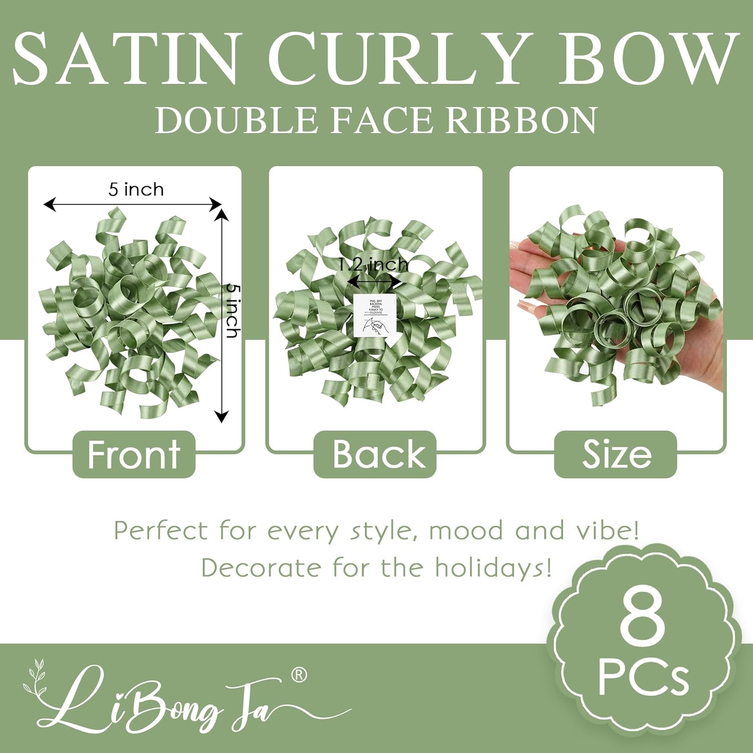 5'' Sage Green Bows Curly Ribbon Bows for Gift Wrapping, Satin Bows with Double-Sided Tape, Self Adhesive Bows for Party, Wedding, Birthday Decor, Premade Bows for Crafts, Wine Glasses-8 PCs