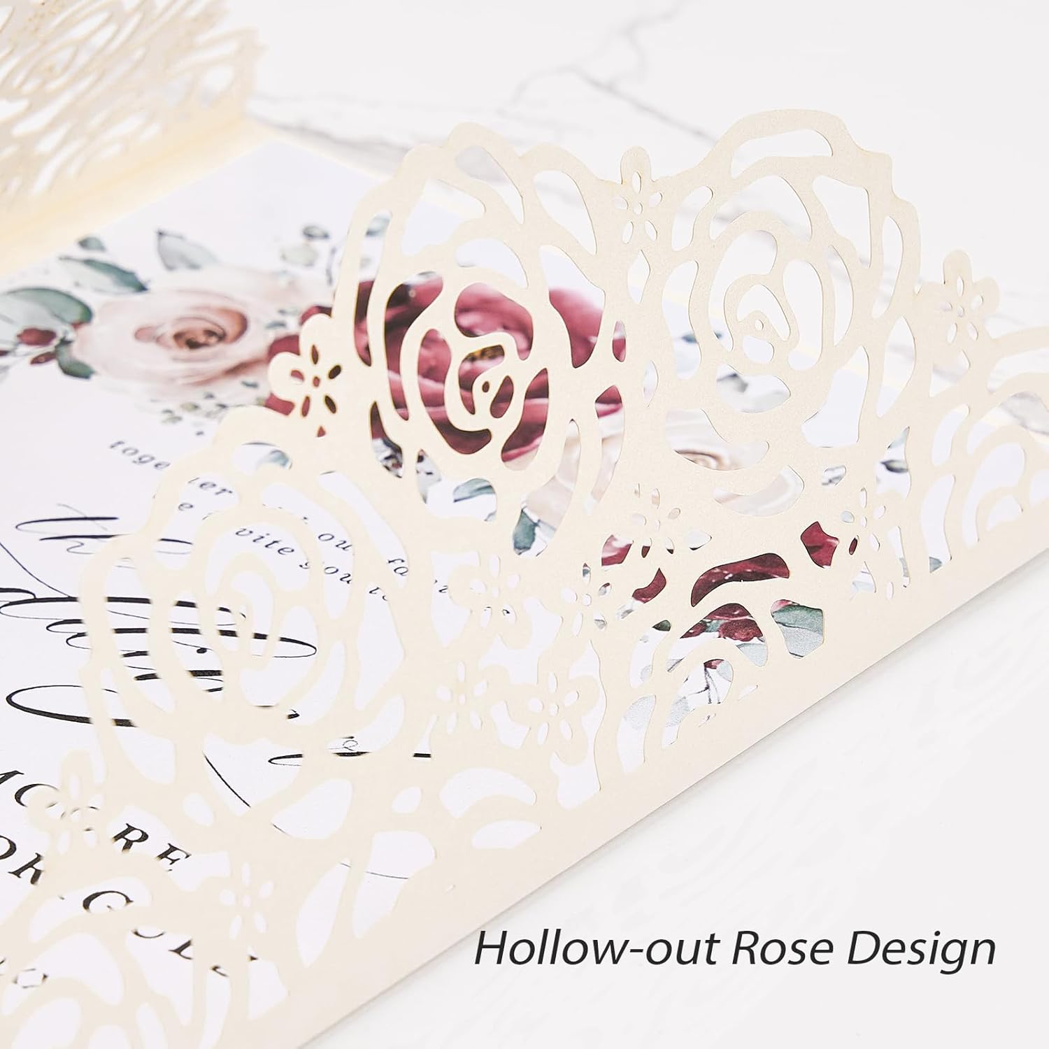 • Size: ivory laser cut invitations pocket 4.9''x7'', invitation paper 4.7''x6.9'', rsvp card 4.7''x3.4'', white envelopes 5.4''x7.7''. If you don't use our inner cards, kindly confirm the size before ordering!