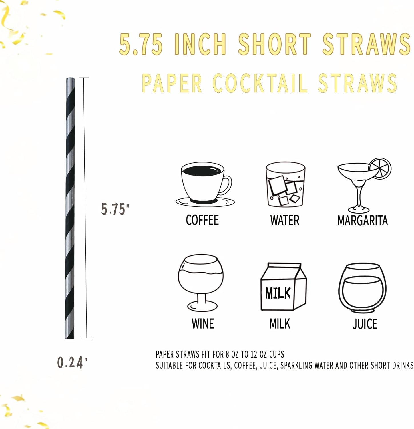 Cocktail Paper Straws - Black Silver Striped Biodegradable Disposable Drinking Straws for Brithday, Wedding, Holiday, Cake Pop Sticks - 5.75 inch