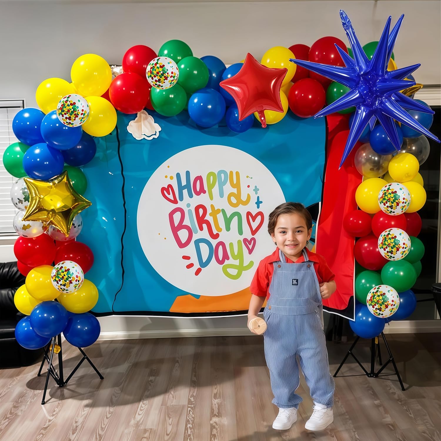 • What You Get - Red Yellow Green Blue Balloon Garland Arch Kit, package including 1pc blue explosion star mylar balloon, 2pcs 10 inches star foil balloons(red*1, gold*1), 3pcs 18-inch balloons(red*1, dark blue*1, dark green*1), 26pcs 12-inch balloons(confetti*6, red*5, blue*5, green*5, yellow*5), 44pcs 10-inch balloons(red*12, blue*12, green*10, yellow*10), 40pcs 5-inch balloons(red*10, blue*10, green*10, yellow*10), 1pc 5-meter balloon strips, 1pc ribbon, 5pcs dot glues. All in one package!