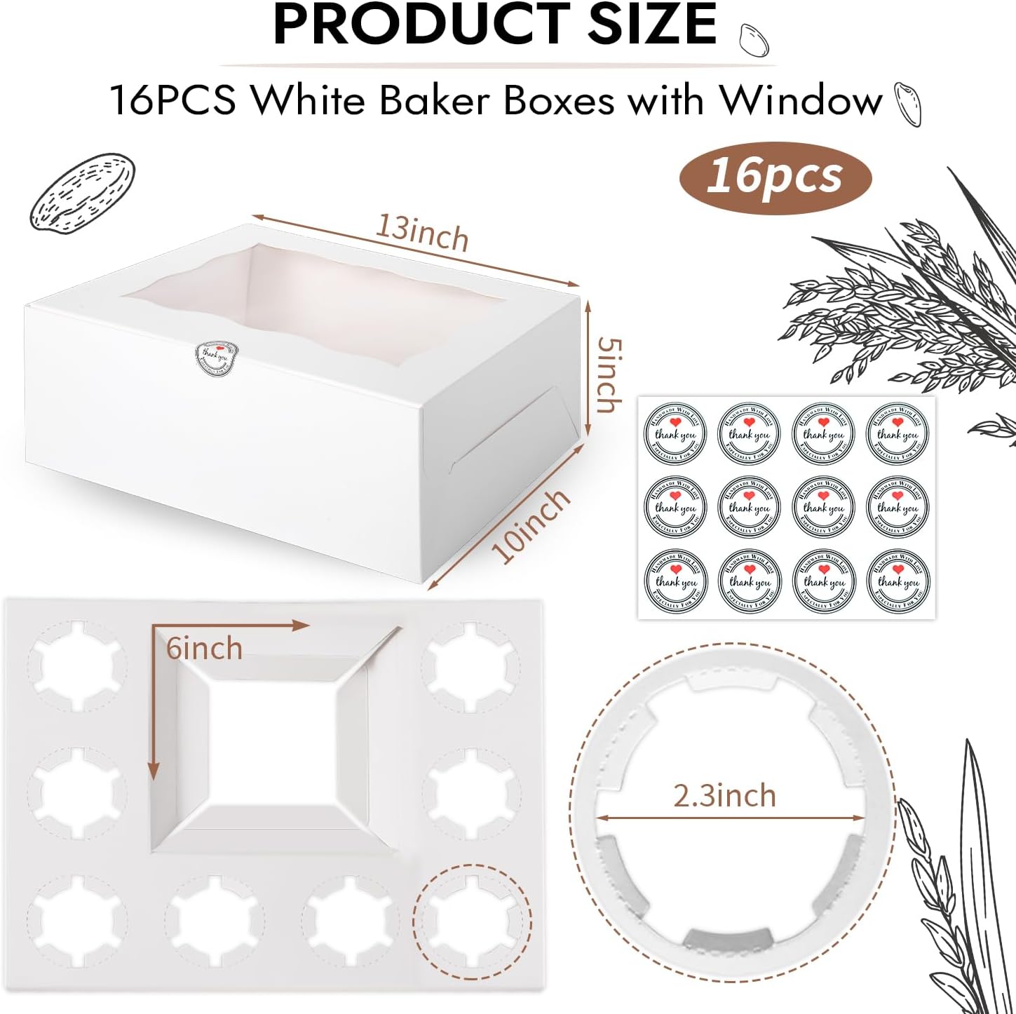 • Package Includes:16 Packs Cake and Cupcake Box Combo with Clear Window.cupcake boxes + inserts+ Stickers.The paper inserts keep the cupcakes stay in place from moving around. The cake box has a wide viewing angle, perfect for showcasing cakes while protecting them. It is a great choice for making cupcakes and pastries.