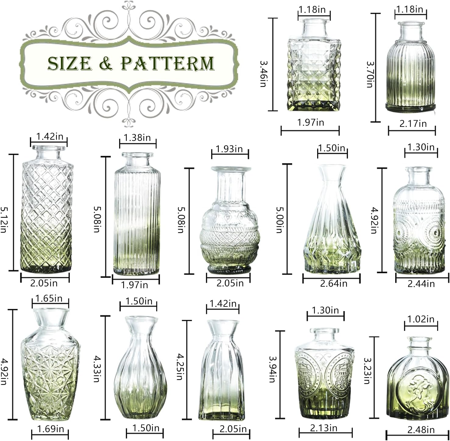 • Vintage Vase: You get 12 green bud vases, each small glass vase is decorated with etched patterns to further enhance its attractiveness. These flower vases boast a vintage design, equally suited for elegant centerpieces and casual home decor, perfect for displaying on windowsills, dining tables, or wedding reception displays