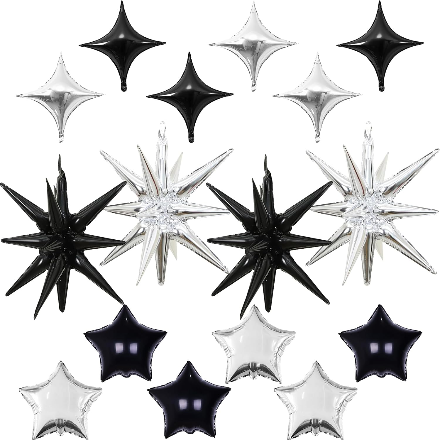 • Black Silver Balloons Set: Package includes: black, silver two-color aluminum foil star balloons (explosion stars × 4, four-pointed stars × 6, five-pointed stars × 6) , a straw and ribbon