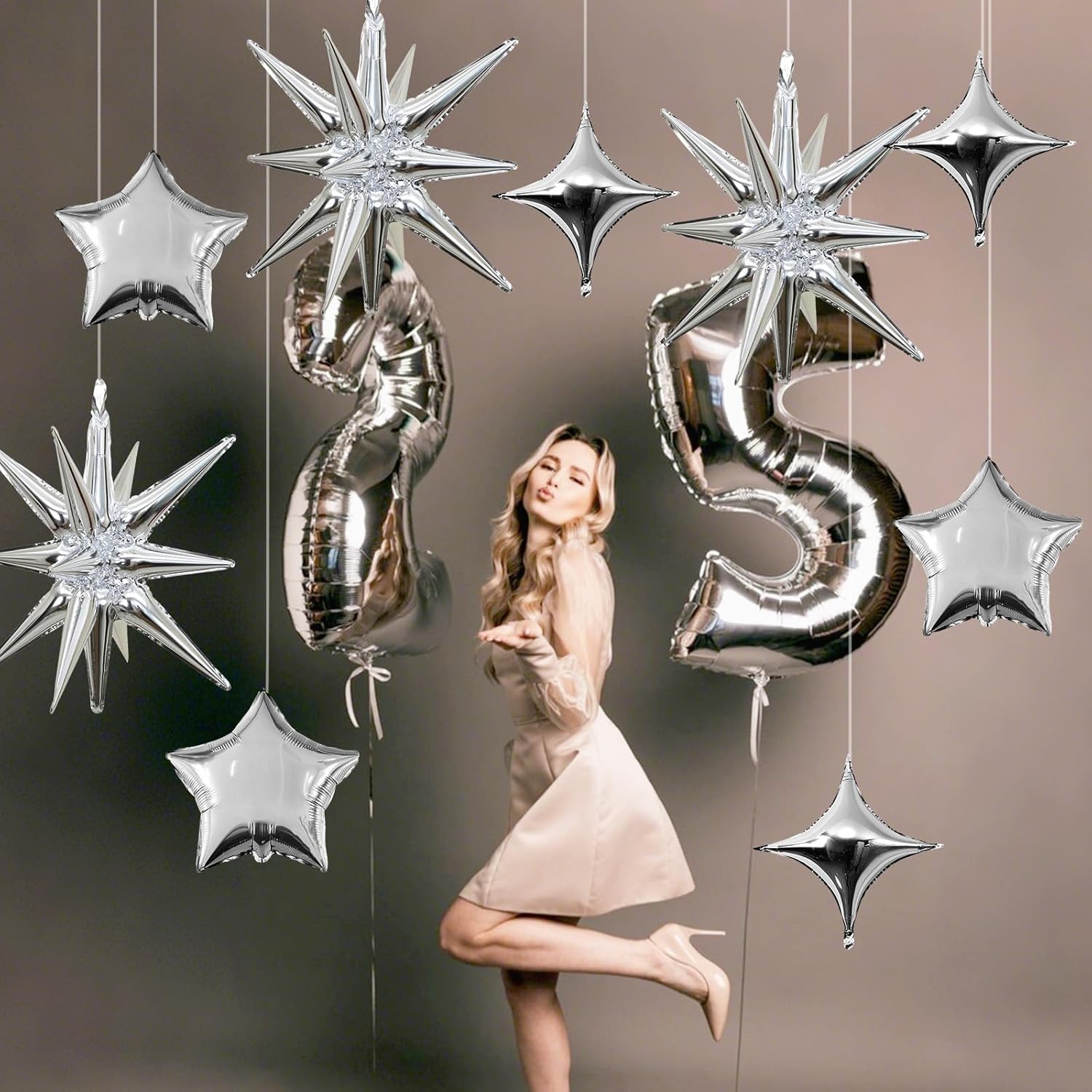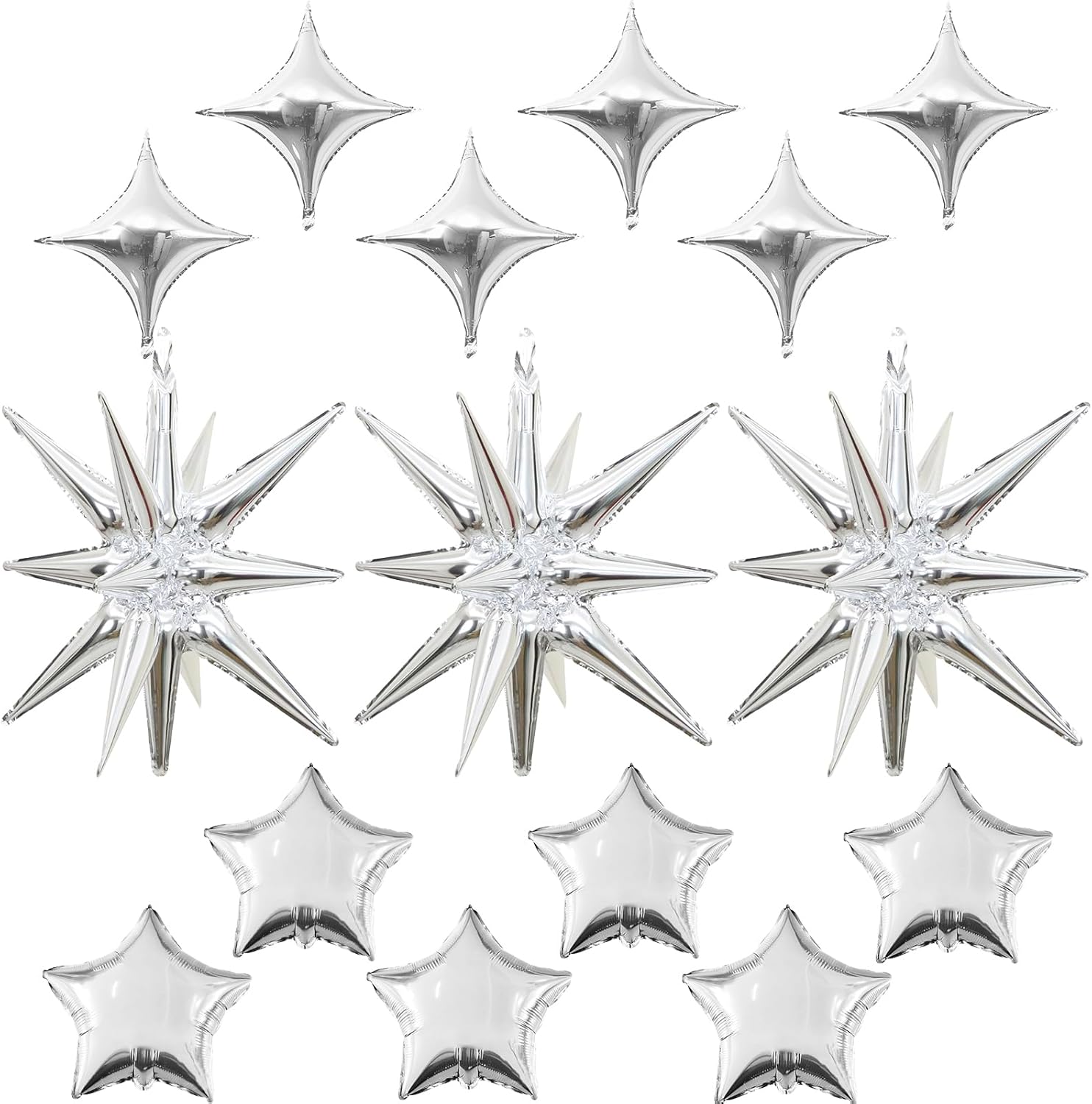 • Silver Star Balloons Set: Package includes: silver aluminum foil star balloons (explosion stars × 3, four-pointed stars × 6, five-pointed stars × 6) , a straw and ribbon
