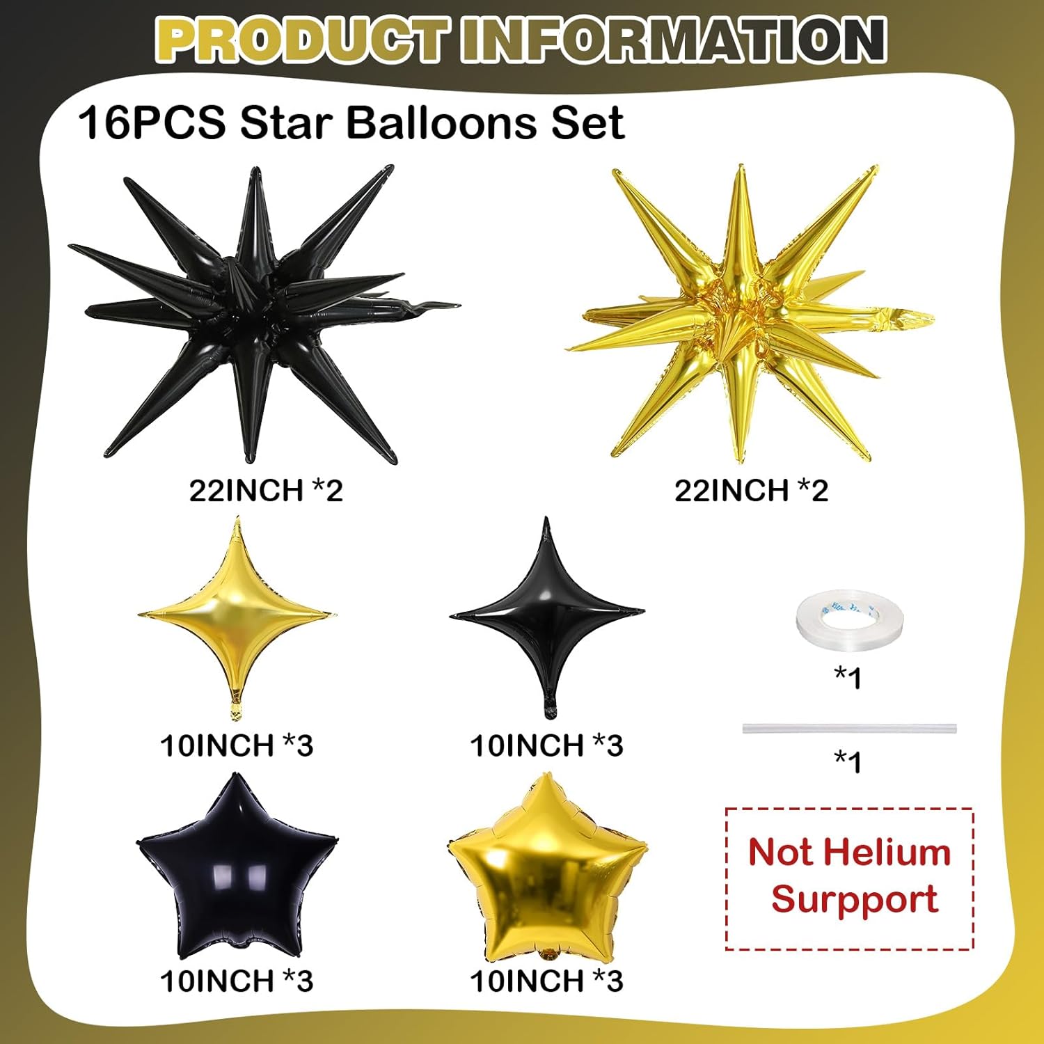 • Black Gold Balloons Set: Package includes: black, gold two-color aluminum foil star balloons (explosion stars × 4, four-pointed stars × 6, five-pointed stars × 6) , a straw and ribbon