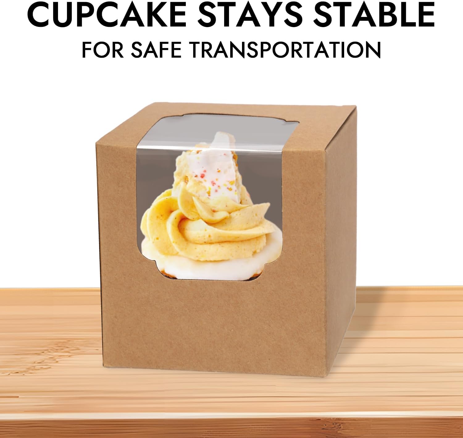 JCD 120pcs Cupcake Boxes, 3.5inches Individual Pre-Assembled Kraft Brown Cupcake Boxes with Window Single Cupcake Containers for Mother's Day, Birthdays, Baby Shower (Brown/120Pcs)