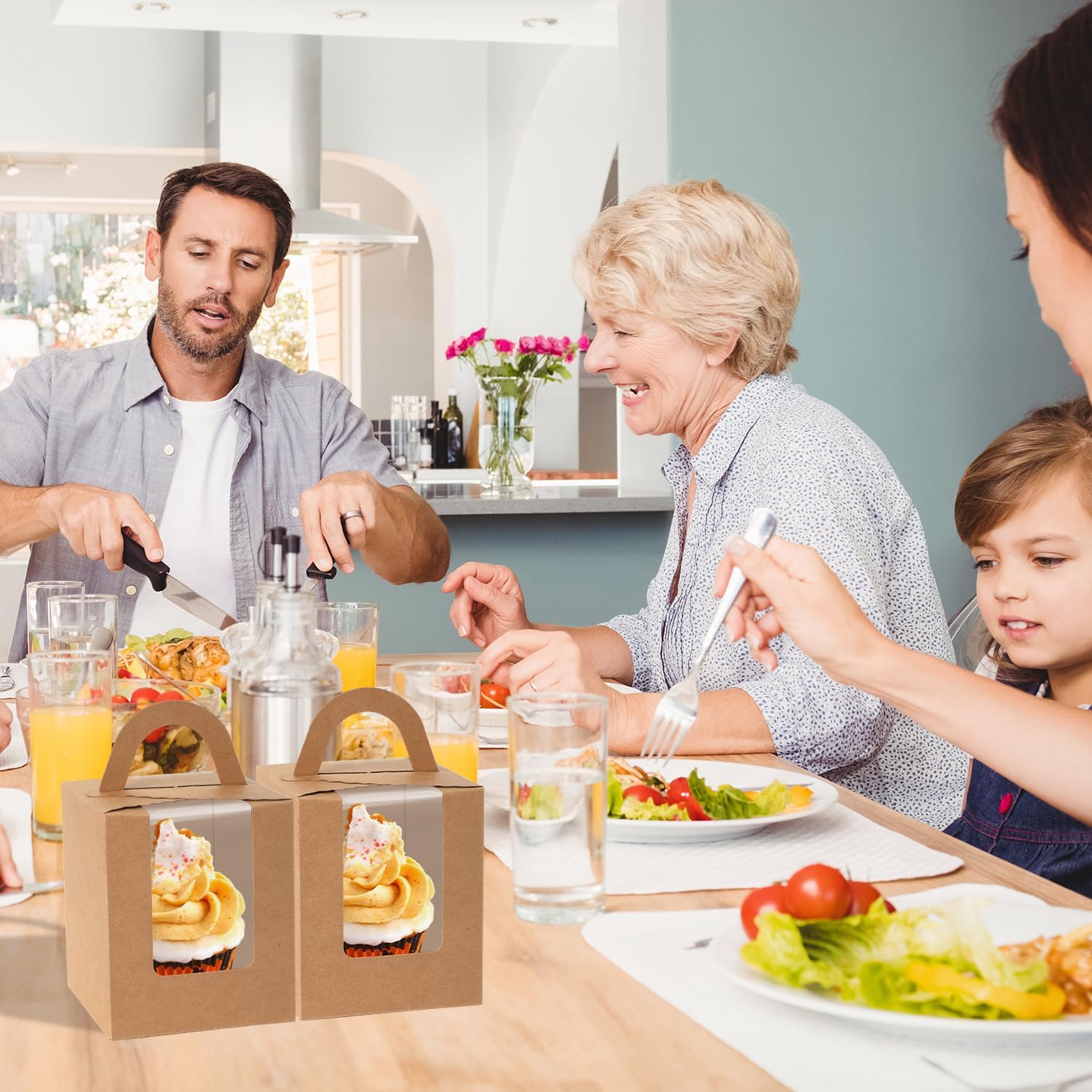 JCD Cupcake Boxes Kraft Paper, 120pcs Portable Cupcakes Holder Containers,Individual Cupcake Container Brown with Window Insert and Handle, Pastry Box Muffins Holder for Bakery Wrapping (Brown/120Pcs)