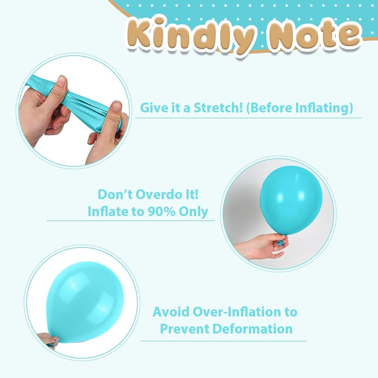 • Party-Ready Tips: Please be careful not to overfill the balloon to avoid bursting,away from sharp objects and direct sunlight to prevent damage. Please note that it is normal for 2-3 balloons out of the all to have some damage or small holes. If you have any questions or need assistance, please don't hesitate let us know.We will help you within 24 hours.